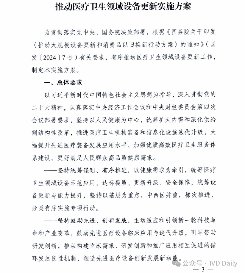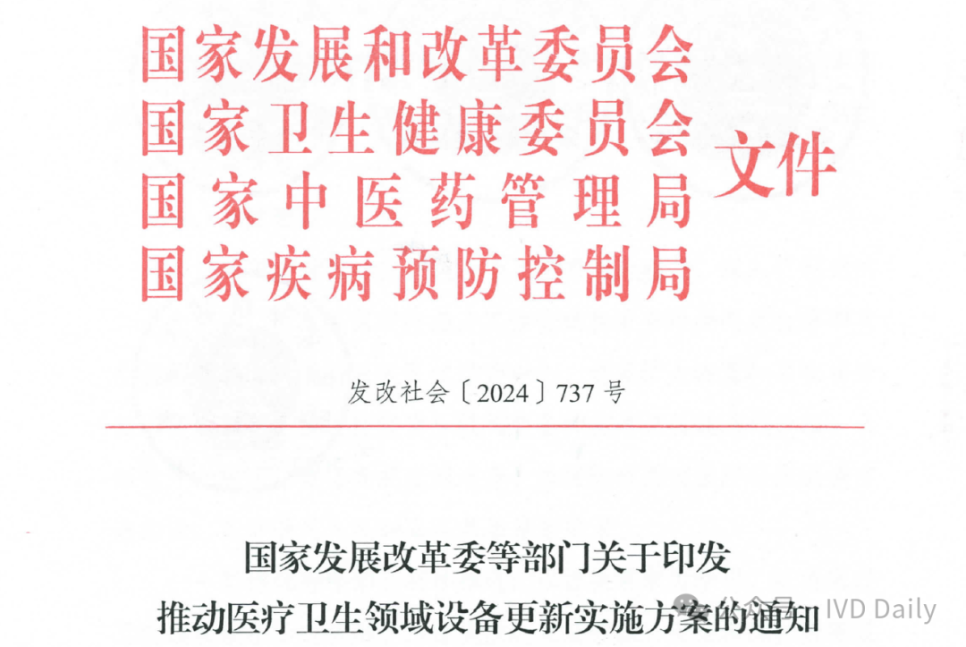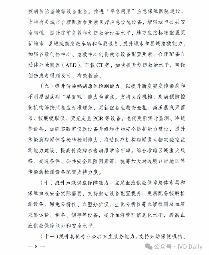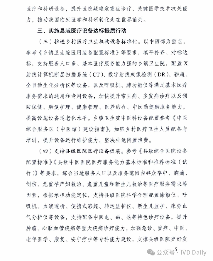 近日,国家发改委、国家卫健委、国家中医药管理局、国家疾控局四部委联合印发《关于推动医疗卫生领域设备更新实施方案的通知》。 通知明确到2027 年,医疗卫生领域设备投资规模较2023年增长25%以上,高端医疗设备短板加快补齐,县域基层医疗设备条件持续改善,有力支撑基层医疗服务能力提升和分级诊疗制度建设,应对重大公共卫生安全风险的医疗设备保障和应急能力明显提升。 鼓励拔尖医院重大医疗设备配置升级 适度超前配置,推动产学研转化! 聚焦肿瘤、心脑血管病、代谢性疾病等严重危害人民群众健康的重大疾病,鼓励国家医学中心等一批国内拔尖医院对标国际一流水平,适度超前配置一批高端放疗设备、超高场强磁共振成像系统、手术机器人、高分辨质谱仪、超高分辨率显微成像及分析系统等融合型、交叉型重大医疗和科研设备,提升医院疑难危重症诊疗、关键医学技术攻关能力,推动我国临床医学和科研转化走在世界前列。 推进乡村医疗卫生机构设备标准化 基层医疗规范标准! 以中西部为重点,参考《乡镇卫生院医用装备配置标准》等要求,填平补齐、对标达标,支持服务人口多、基本医疗服务能力强的乡镇卫生院,配置x射线计算机断层扫描系统(ci)、数字射线成像检测(DR)、彩超、全自动生化分析仪等设备,以及呼吸机、肺功能仪等满足基本医疗服务需求的通用和专用设备,加快提升常见病、多发病诊疗以及预防保健、康复护理、健康管理、医养结合、中医药健康服务能力,提高设施设备适老化水平。乡镇卫生院中医科设备配置参考《中医综合服务区(中医馆)建设指南》。加强乡村医疗卫生人员配备与培训,提升设备运行维护能力,坚决杜绝闲置浪费。 支持县级医院医疗设备提质 五大中心建设再提速! 参考《县级综合医院设备配置标准》《县级中医医院医疗服务能力基本标准和推荐标准(试行)》等要求,综合当地服务人口以及服务范围内群众卒中、胸痛、创伤、危重孕产妇救治、危重儿童和新生儿救治等医疗服务需求等因素,根据承担功能定位,支持县级医院科学合理配置除颤仪、呼吸机、血液透析、便携式彩超、转运监护仪、新生儿监护、床旁血气分析仪等设备,支持配备中医电、磁、热等特色诊疗设备,提升肿瘤、心脑血管疾病等重大疾病诊疗能力,加强急诊、重症、中医、老年医学、康复、安宁疗护等专科能力建设,支撑县级医院更好发挥县域龙头作用。 加强县乡村医疗服务协同联动 推进县域医共体建设;基层结果互认! 推进紧密型县域医共体建设,提升医学检验、医学影像、心电诊断、病理诊断、消毒供应等资源共享中心设备配置水平,统筹县域肿瘤防治、慢病管理等临床服务相关设备配置,提高资源配置和使用效率。推动基层医疗卫生机构设备数字化替代,支持模拟设备加快向数字化设备转型升级,支持配置临床诊疗实用型、小型化、集成化、可移动医疗设备,探索配备装配DR、快速检验等设备的智能化巡回医疗车等。支持共享中药房设备配备,提高智慧化中医药服务能力。提高人工智能辅助诊断技术在县域医共体内应用能力,促进远程医疗延伸到乡村,推动基层检查、上级诊断、结果互认,助力实现“一般病在市县解决,日常疾病在基层解决”目标。 实施城市医疗设备更新升级和数字化转型行动 支持省域医学高地设备更新扩容和数字化转型 围绕实现大病不出省目标,支持国家区域医疗中心、省级高水平医院、中医特色重点医院等,配置磁共振成像系统(MR). x 射线计算机断层扫描系统(CT)、数字减影血管造影检查(DSA )等医学影像设备,医用直线加速器、手术机器人等治疗设备,体外膜肺氧合机(ECMO)、呼吸机、远程监护等生命支持设备。推动数据驱动型信息化建设模式,推进医疗设备智能化改造升级,升级计算、存储、安全等基础设备,提高医疗数据资源的高效汇集、安全使用、合规分析能力。加强远程医疗和信息化设备配置,强化中医类医院相关信息化设备更新换代,支撑提升疑难危重症及罕见病诊治能力,让群众在省域内享有更加公平可及、系统连续、高质量的健康服务。 加快城市医院老旧设备淘汰更新 提质扩围,设备更新换代! 以人口净流入量大、公共服务缺口大的城市为重点,加快淘汰落后低效、故障率和维修成本过高的医疗设备,更新换代高性能磁共振、彩超、胃肠镜等需求大的诊疗设备,缩短患者排队等候时间。推进紧密型城市医疗集团等医联体建设,更新换代精准化、便捷化、智能化、远程化医疗设备和信息化设施,提高医疗资源配置使用效率。鼓励城市二级医院转型,更新换代康复护理、监护、中医诊疗等智能医疗设备。推广应用远程诊断、远程治疗、远程教学系统,发展应用脉诊、康复等智能中医诊疗设备,提高医疗服务效率和质量。支持社区卫生服务中心设备更新升级。协同病房改造提升行动,配备补齐监护仪、即时即地检验(POCT )等床旁设备及康复训练设备,适度加装电梯、无障碍、移乘设备等,改善病房住院条件。
