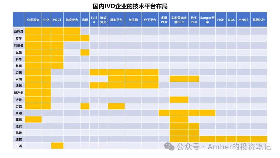 - 而圣湘、达安、凯普、迪安没有涉及化学发光平台,而是主要覆盖分子诊断平台,并且圣湘、迪安覆盖的分子技术种类相对较多。