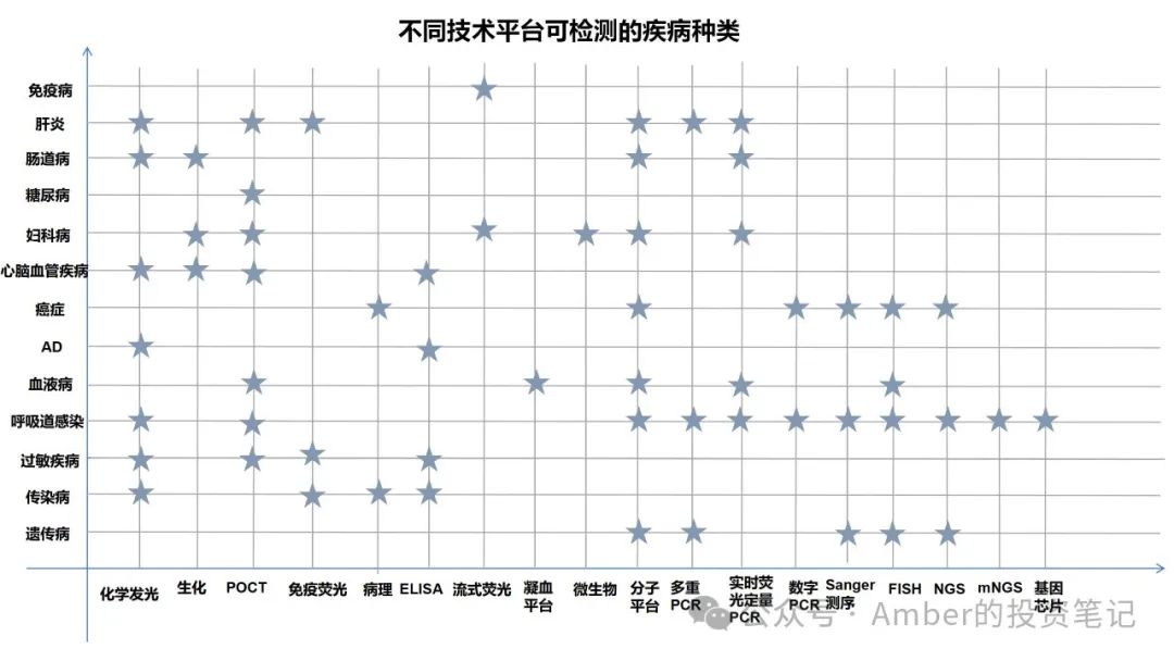 “一种疾病可由多种技术平台检测出结果,同一技术平台也可检测不同的疾病种类。”- 生化诊断侧重于已经发生的疾病检测,免疫诊断侧重于已经感染的疾病检测,而分子诊断则对感染初期和有可能发生的基因性疾病具有独特的检测优势。
