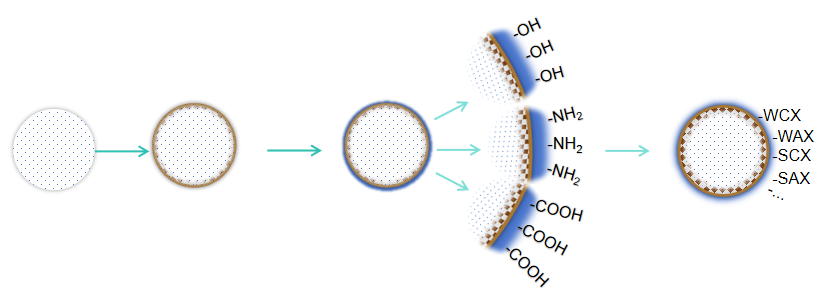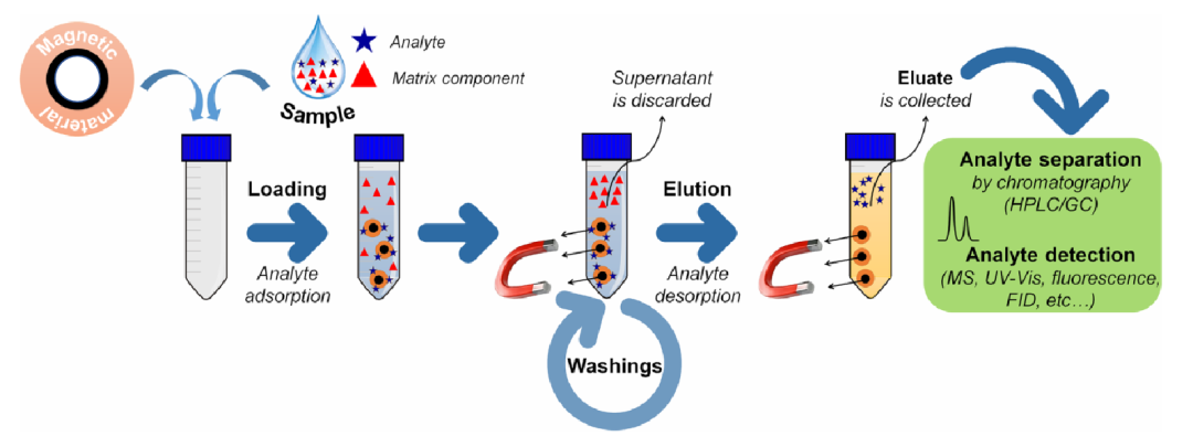 作为质谱用前处理用磁珠,并不是我们上述所提到的化学发光磁珠、免疫磁珠等,而是一种新型的磁性固相萃取微球材料,是利用了超顺磁性在受磁场作用磁化向磁场一侧移动和聚集,撤去外加磁场之后磁珠恢复到磁化强度为0的初始状态,重新分散于介质中的工作原理,但发挥捕获生物样本中的目标物的功能的却是表面所带有功能基团,包括离子交换基团、亲水亲脂基团、疏水反相基团等与传统固相萃取填料一样的。因此既要保留固相萃取材料的功能性,又要具备超顺磁性带来的可借助磁场移动的能力,同时还要实现磁珠的单分散性、键合相、载量等来确保定量的准确性与精密度等方法学验证可通过,可想而知难度更大。