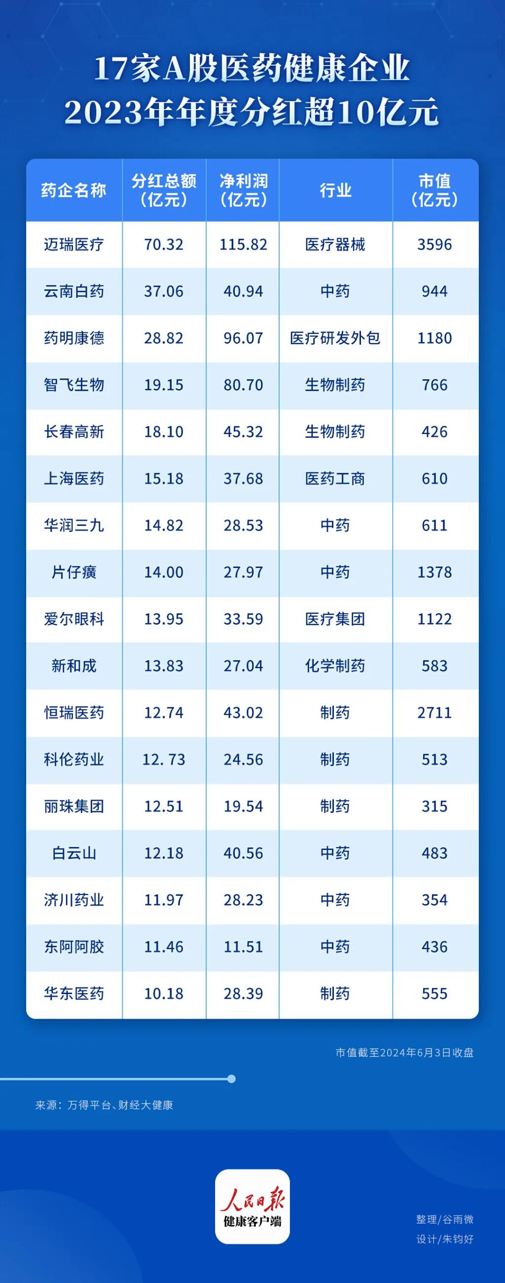 整理自人民日报客户端、中新经纬 据人民日报健康客户端不完全统计,在医药健康行业,2023年年度分红超过10亿元的企业共有17家。其中,迈瑞医疗分红金额为70.32亿元,分红总额稳居医药健康企业第一名。 迈瑞对股东不抠门,6年累计分红近248亿元。 2018年至2023年,迈瑞医疗每年分红金额分别为12.16亿元、18.24亿元、30.39亿元、42.33亿元、54.56亿元、70.32亿元,占当期归属净利润的32.69%、38.96%、45.65%、52.90%、56.79%、60.72%,无论从分红金额还是从派现比来看都在逐年上升。 六年来,迈瑞医疗累计分红总额近248亿元,是公司IPO募资额的4.2倍。按申万行业统计,迈瑞医疗所属的医药生物行业共有371家公司公布了2023年度分配方案,迈瑞医疗是派现金额最高的企业。 |
