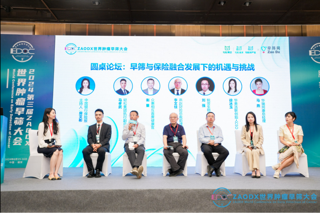 中国银行保险报房文彬女士主持了圆桌讨论“早筛与保险融合发展下的机遇与挑战”,轻松集团执行副总裁马孝武先生、众惠相互首席健康官衡量先生、燕赵财险总裁助理李文佳先生、锐翌生物执行总裁刘强先生、华美浩联创始人CEO徐冰玉女士、华瑞同康总经理马燕女士作为圆桌嘉宾进行了分享。 “早筛与保险融合发展下的机遇与挑战”圆桌