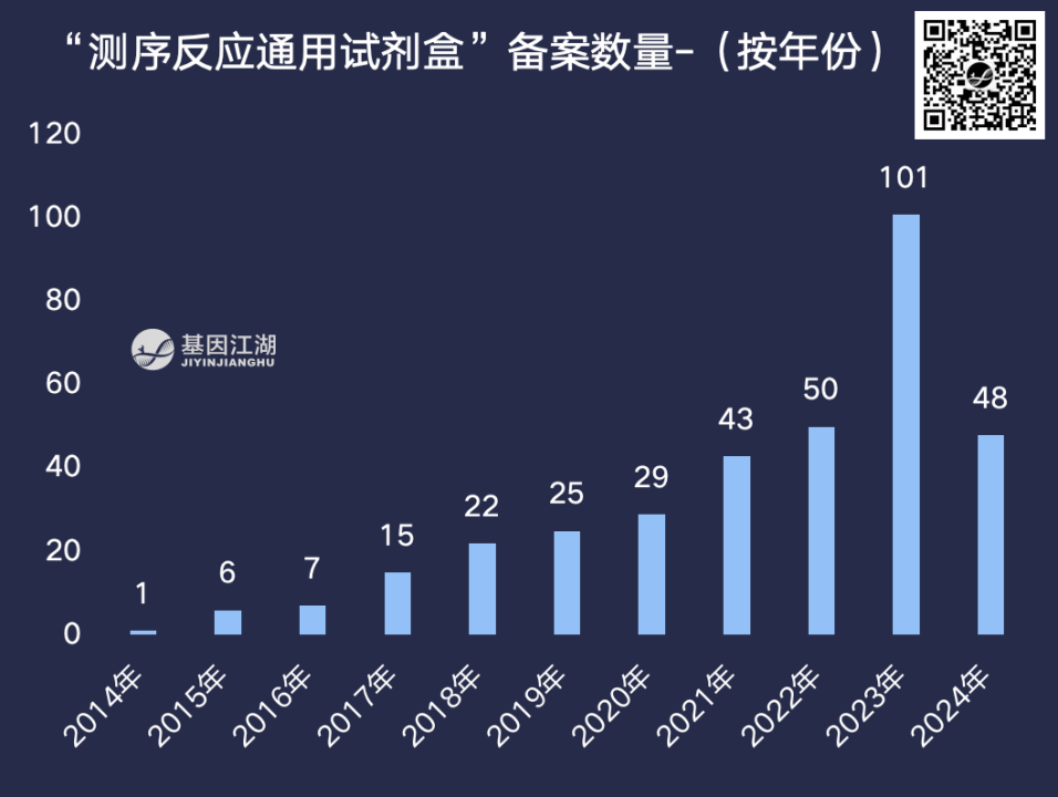 从图中可以看出,2023年以前,“测序反应通用试剂盒”的备案数量,呈现逐年上升趋势,并在2023年达到历史最高点。 2024年新版分类目录发布后,后续会如何?且待观察。 (*历史首个“测序反应通用试剂盒”备案,毫无例外又被“创新审批第一证”的华因康摘得。)