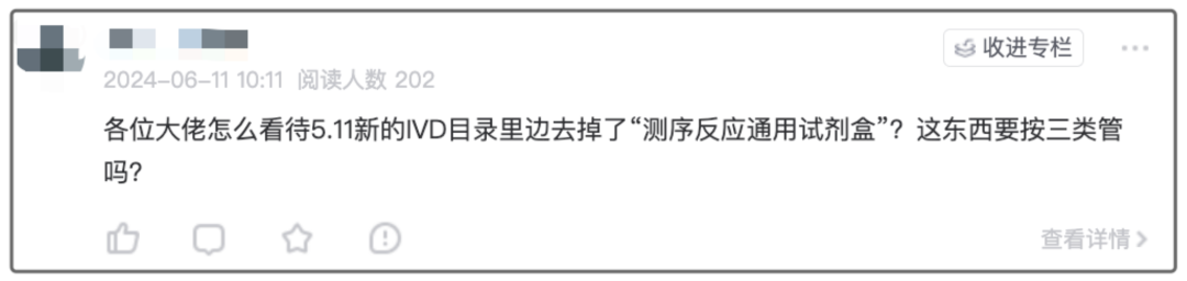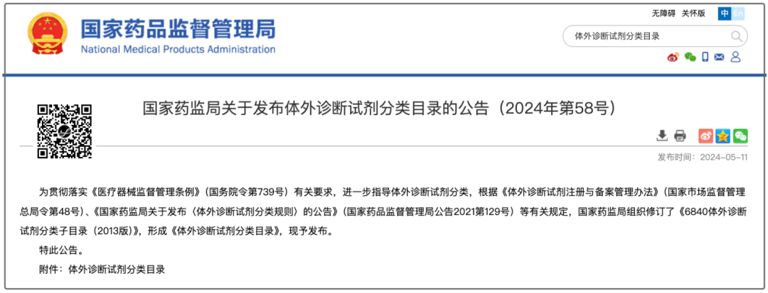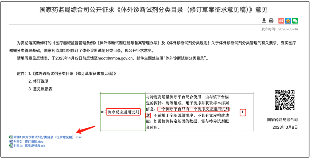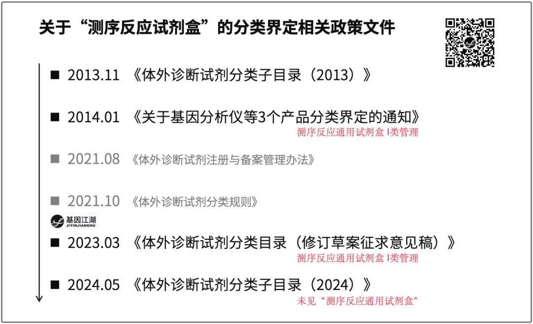 指的是,在5月10日,国家药监局最新发布的《体外诊断试剂分类目录》,未包含“测序反应通用试剂盒”。 正好前段时间和朋友简单聊到过这个问题。 为什么把这个单独拎出来讨论? 业内朋友知道,“测序反应通用试剂盒”,并不是一个简单的I类试剂(此前);在很多时候,它还承载了商业合作中的“更多功能”。 当该试剂盒在最新的分类目录“消失”,这种“消失”,是暂时的,还是永久的,成为一个时代的产物?以后会怎么管理?既往已备案成功的试剂盒会作废吗? 最关键的,是否会影响到各企业的商业进程?“擦边球”式的打法就此终结了吗? 笔者能力和信息有限,本文只做简单梳理,不做任何推演。请读者朋友们自行评估事件影响。 消失的“测序反应通用试剂盒”... 2024年5月10日,国家药监局印发新版《体外诊断试剂分类目录》: