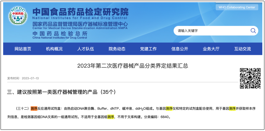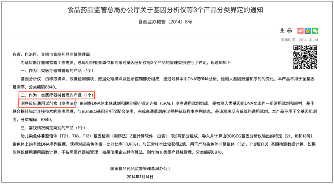 对比《征集稿2023》和《正式稿2024》,大家会发现: 《征集稿2023》中的按I类管理的“测序反应通用试剂盒”,并未出现在《正式稿2024》中。 翻看历史,关于“测序反应通用试剂盒”管理分类的界定,最早可以追溯到国内测序历史上的一次著名通知(2014年):