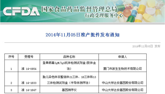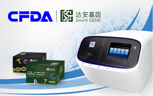 2014年11月5日,国家食品药品监督管理总局批准了达安基因的基因测序仪和胎儿染色体非整倍体21三体、18三体和13三体检测试剂盒(半导体测序法)医疗器械注册。目前,国内唯一两家获得国家二代测序仪及无创产前试剂盒注册受理号的单位——华大基因和达安基因,均正式获得了国家食品药品监督管理总局批准的二代基因测序诊断产品。 早在今年6月19日,达安基因的上述批次产品进入国家创新医疗器械特批绿色通道,达安基因此次获批的测序仪及检测试剂盒可进行无创产前检测,通过对孕妇外周血血浆中的游离基因片段进行基因测序,对胎儿染色体非整倍体疾病21-三体综合征、18-三体综合征和13-三体综合征进行检查和辅助诊断。 据悉,达安基因这次获批的基因测序仪DA Proton是获得Life Technologies公司(已被Thermo Fisher公司收购)技术授权国产化的测序仪,是国内市场唯一授权可以销售的测序仪。其技术代表了全球最先进水平,体积只有打印机大小,是专门为临床应用打造的测序仪。DA Proton通过半导体芯片,可在几小时内提供人类基因组、人类外显子组或整个转录组信息,较其它测序技术更快速,能够充分满足无创产前检测早期、快速、低成本的要求。