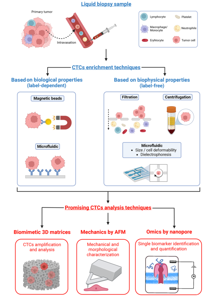 液体活检采集后,CTC富集主要依赖于生物物理学(无标记)或生物学(依赖标记)特性。依赖标记的技术通常涉及基于正或负亲和力的捕获,可以在试管(RosetteSep)或微流控通道(CellSearch或CTCChip)中进行。目前一些无标记技术是基于微过滤(ISET)和微流控设备(Labyrinth chip, Parsortix)的尺寸和变形性,或基于密度的梯度离心(Ficoll-Paque)或双向电泳(DEPArray)。一旦恢复,ctc可以使用仿生3D基质、原子力显微镜(AFM)和纳米孔技术进行扩增和分析。