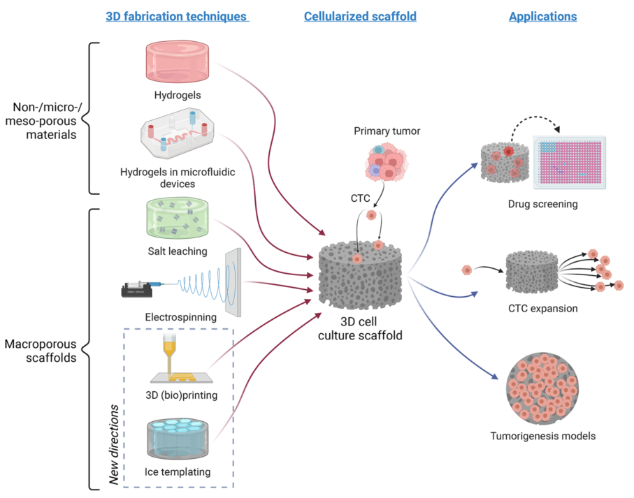 非细胞毒性水凝胶的日益增加在3D细胞培养新材料的开发和使用中发挥了核心作用。能够定制水凝胶成分、几何形状和大孔隙度的材料制造策略的兴起,为特定细胞类型构建相关环境开辟了令人兴奋的新途径。将CTC整合到这些材料中提供了解决药物筛选、CTC扩展或细化肿瘤发生模型等应用的可能性。虚线内是3D(生物)打印和冰模板,这两种技术有望在未来ctc的3D细胞培养支架的开发中发挥核心作用。