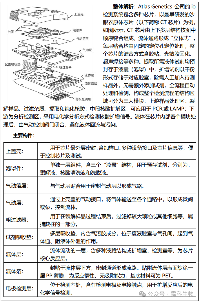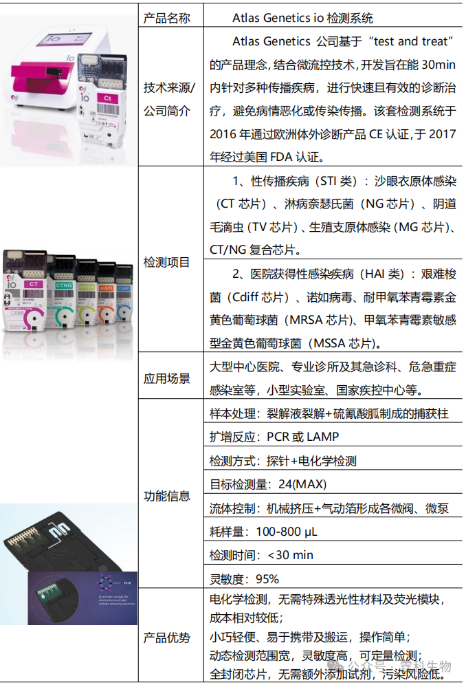 针对沙眼衣原体检测的芯片(CT芯片)是英国Atlas Genetics公司在欧洲上市的第一个性传播疾病io检测芯片,是近些年分子POCT产品经典之作。采用 “微流控+快速PCR”技术,及电化学检测方法,通过芯片内部复杂的气、液路设计,将核酸提取纯化及检测集成在一张耗材中。 这套io检测系统包含微流控检测芯片及配套仪器,集成了样本处理、核酸提取及纯化和检测分析三大模块。使用时,仅需加入样本至芯片后上机,设备自动实现核酸分析等全流程,可在30 min内出结果,解决了传统检测方法中等待时间漫长,环境人员依赖性强等不足。 01 【产品简介】 Atlas Genetics io检测系统的主要特点: 02 【芯片解析】 一、芯片结构(以CT芯片为例) “芯片流体运行视频” 03 【小编点评】 一、产品优势 1、轻巧精致:仪器重量仅为10.2 kg,体积大小为277x275x384 mm3(HxWxD),便于多种医疗场景的使用。采用电化学检测方法,成本较低。采用不同二戊铁衍生物,可进行更多种复杂指标的检测应用。 2、仪器操作简单,仅需人工加样至芯片后,其他试剂使用及分析检测全自动化运行,封闭式操作,无交叉污染风险。常温存储条件下,耗材存储效期可达12个月,特别适合需要批量使用但无合适冷藏条件的应用场景。 3、动态检测范围宽,检测灵敏度可与金标准媲美,与市场同类产品存在竞争优势。单一芯片可对一个样品进行多种病原菌检测,检测时间快、即时应对医疗诊断,降低了病情恶化及传染风险。 二、技术难度或门槛 1、Atlas Genetics公司的io检测系统芯片内部含多种微结构,如阀、腔室、微通道等,既需要气动也需要机械控制,来完成流体的准确控制,芯片仪器的配合要求较高。 2、封装工艺的选择与控制。芯片组件包括塑料组件与柔性材料,不同材料之前的键合对工艺选择、参数调试具有挑战性,进一步,除了流道、试剂腔室的封存,该芯片还增有气动结构,对气密性的要求较高,任何漏气点都将导至驱动或控制失效,因此,对工艺稳定性要求颇高。 三、技术平台的应用展望 Atlas Genetics公司的io检测系统能够更快、即时地做出现场应答,覆盖面广,可应用于多种医疗所需场景,有效的降低了病情恶化的风险。面对发病率较高的院内感染病例,该款检测系统也同样适用,正如近期基于该产品进一步扩大产品制造而完成的6500万美元(约折合人民币4.7亿元)F轮融资,相信未来可基于该平台开发更多检测项目。 注: 1.参考文献:专利US9662650,US20160158746 2. 图片来源:Atlas Genetics官网、公众号和其他互联网公开信息; |