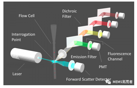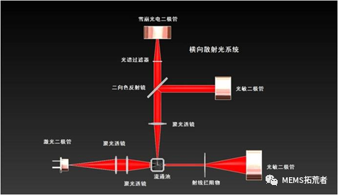 流式细胞仪光学系统:流式细胞仪采用散射式光电检测。