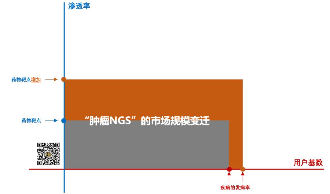 其价值在于去“提示”某种疾病,比如早筛/辅助诊断,或者跨界来看t/mNGS也是这一类。 这一类产品的检测市场规模是下面这个图: 其中横轴的“用户基数”与疾病的用户感知密切相关,纵轴的“渗透率”与疾病诊断的复杂程度紧密挂钩。