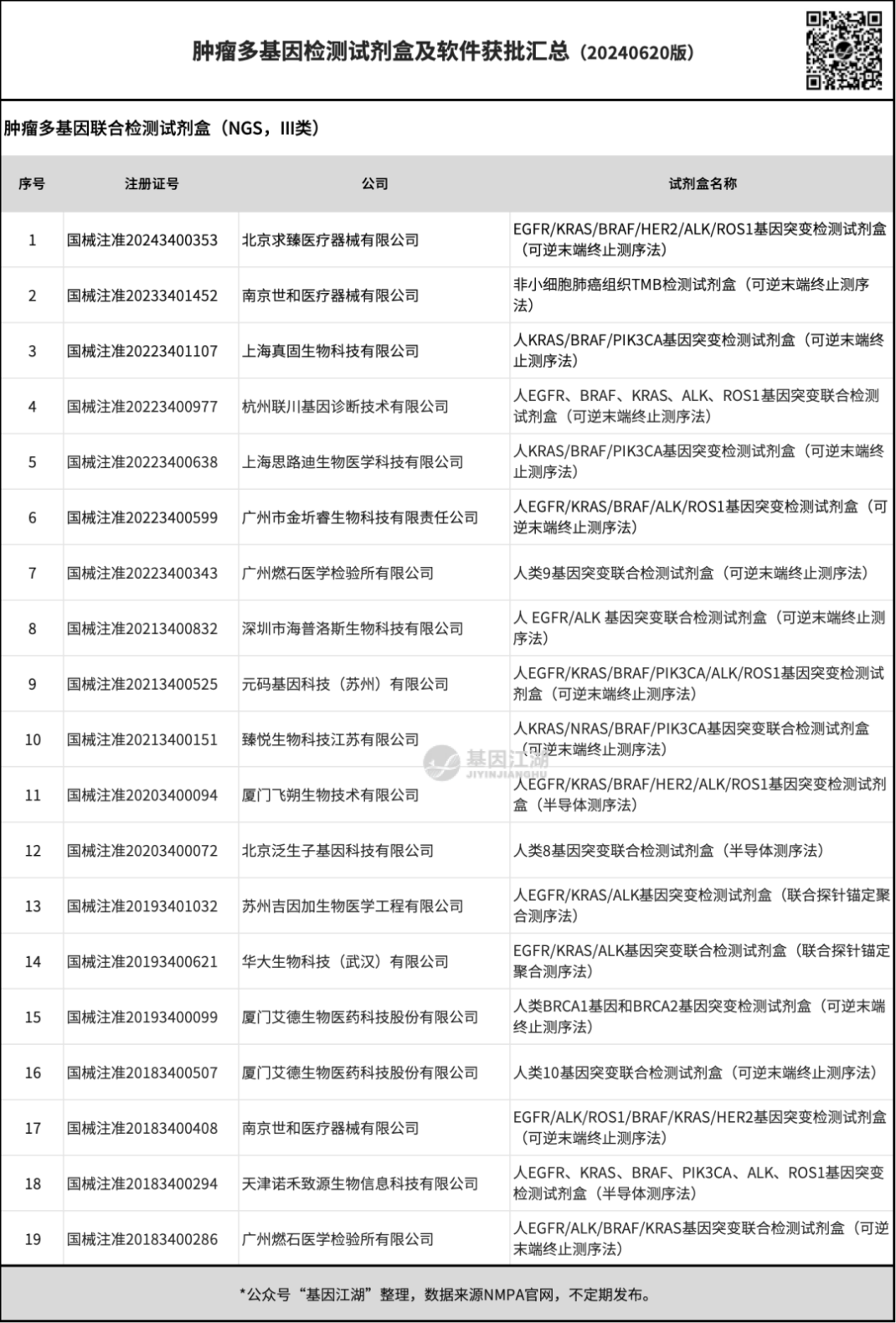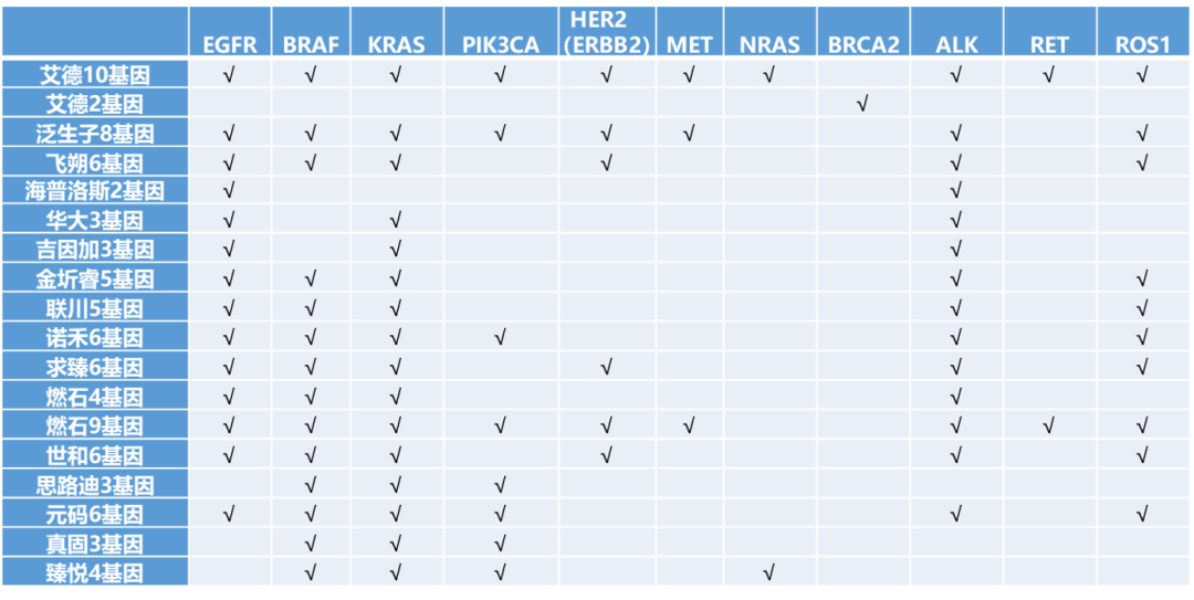 只关注多基因小Panel的话(不包括世和基因的大Panel TMB试剂盒),已有18个相关产品获批。 汇总了一下18个多基因小Panel试剂盒的目标基因检测表:
