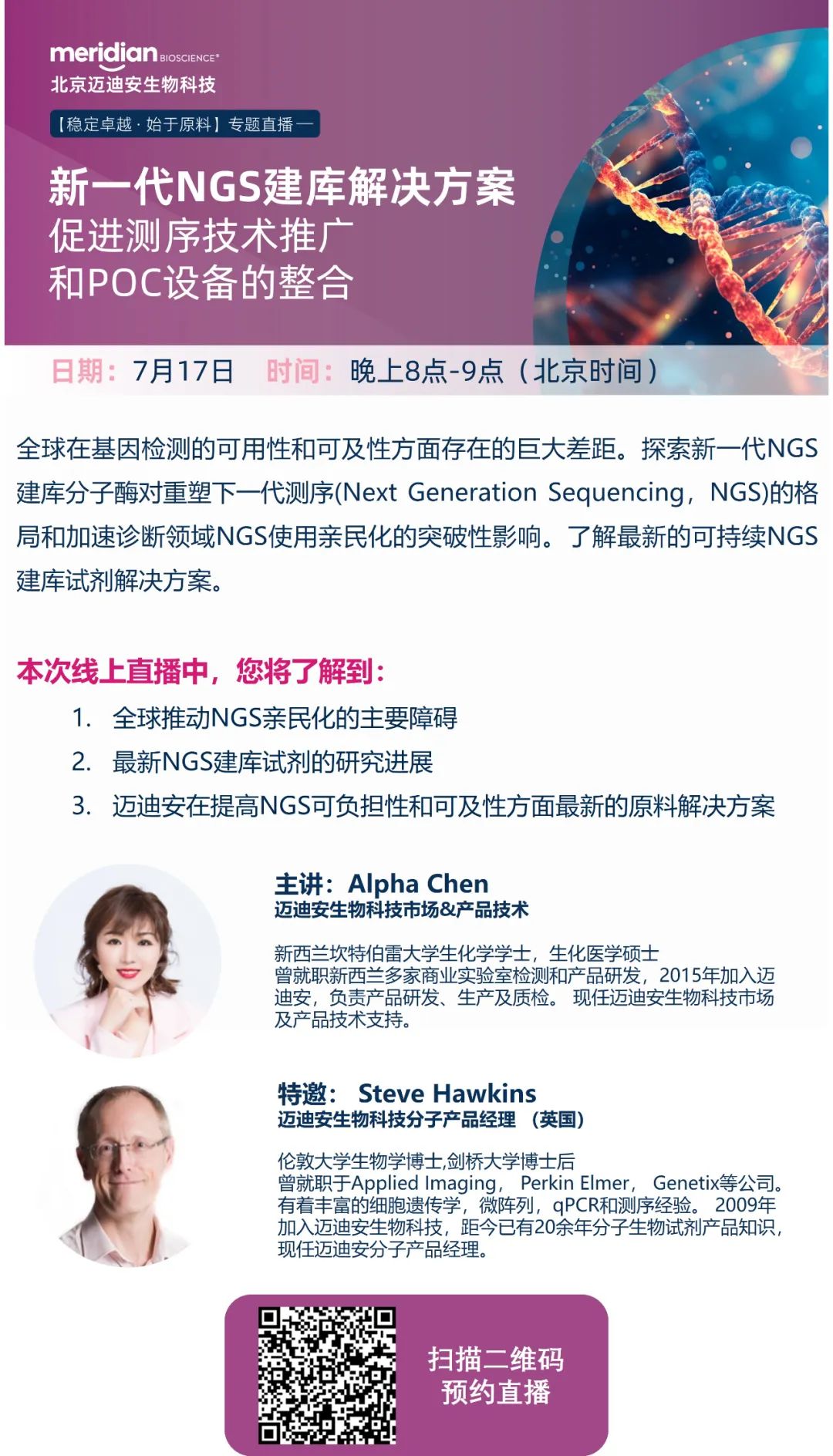 Pounch#2 包含1管:用于文库富集的高保真Pfu酶及反应缓冲液。这是一个可选步骤,PCR free的建库流程可以不使用这一组分。 该试剂盒包含了NGS建库所需要的所有分子酶成分,全部是现成的冻干反应试剂,只需要添加片段化的DNA即可开始建库程序。 其中,将末端修复、加A尾和连接接头三个反应集合在单管内一步完成,大大简化建库流程,节省反应时间。 该试剂盒可以在常温下运输和储存。经验证,该冻干试剂盒可在常温下保存至少12个月。并且,冻干试剂和液体试剂获得的NGS文库质量完全一致 ,数据将在7月17日的直播中分享,欢迎扫描下图二维码或点击文末‘阅读原文’预约直播。 Meridian生命科学研发副总裁 Florent Chang-Pi-Hin博士表示: “我们的冻干NGS建库试剂盒体现了Meridian坚定不移地致力于为诊断检测制造商提供创新、环保和高成本效益的解决方案。作为同类产品中的先驱者,该试剂盒标志着在提高NGS技术的可及性、可持续性和可负担性方面取得了重大飞跃。 有了这种冻干NGS建库试剂盒,我们可以解决市场上的关于NGS检测减少冷链储运依赖的关键需求。我们的客户现在可以依赖一种满足其技术要求并符合其可持续性和成本节约目标的解决方案。 这项创新产品加强了Meridian在为全球诊断制造商提供新一代尖端上游原料方面的领导地位。”