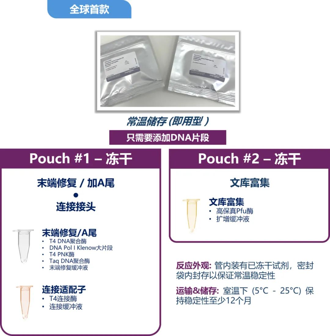 全球市场首个冻干NGS建库试剂盒! 这一开创性的产品强调了Meridian对生命科学行业推行可持续(sustainable)和高成本效益(cost-effective)解决方案的承诺。结合今年4月推出的无甘油NGS建库分子酶产品系列,Meridian正逐步成为开发创新、环保、低本高效诊断检测的行业领导者! 近年来,基因测序已成为医疗保健领域的一个强大工具,为我们的基因构成和各种疾病的易感性提供了有价值的信息。尽管基因测序价格在不断下降,但是一直以来全球范围内在基因检测的可用性和可及性方面存在的巨大差距,而使得很多资源有限的环境和地区无法使用基因测序。 目前基因组数据缺乏来自所有人群的代表性,无法捕捉不同种族和地理区域的基因多样性。许多疾病在患病率、严重程度和对治疗的反应方面都会因受种族和血统影响的遗传因素而有所不同,所以缺少人群代表性的基因组数据对很多遗传疾病的研究造成很大限制。 造成这一问题的主要原因是NGS检测试剂需要冷链储存和运输,从而使得高成本、复杂物流、占用空间和能源等一系列挑战,是NGS检测普及推广和实现亲民化的关键挑战。 目前,头部的NGS测序公司已经意识到这个问题,并已经开始着手开发解决方案。 为了为NGS测序开发企业提供相应的解决方案,迈迪安于今年4月推出了全系列无甘油NGS建库分子酶产品,用于开发常温稳定的NGS建库试剂。 该试剂盒是为合成测序法(SBS)设计的,包含了两个部分,Pouch #1和Pouch#2,分别用于末端修复/加A尾/连接接头和文库富集,均是已冻干试剂,只需要直接添加DNA片段即可开始制备文库。Pounch#1 包含两管: