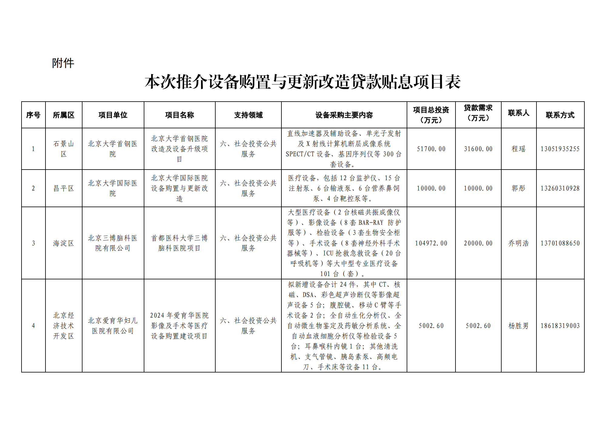 | 近两周内,医疗设备更新项目密集推进,涉北京、广东、吉林、福建… 01 北京八家医院,设备更新项目通过联审 近日,北京发改委发布《关于公开推介北京和睦家中西医结合医院有限公司医疗设备购置项目等11个设备购置与更新改造贷款贴息项目的通知》。