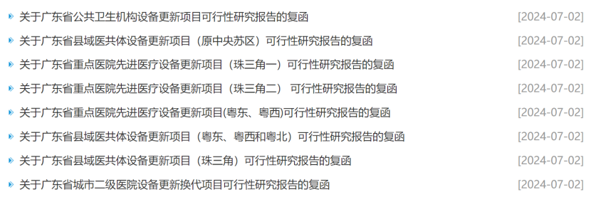 据悉,北京2024年首批项目征集工作已完成,共征集项目193个,目前已陆续开展项目联审。将坚持“成熟一批、联审一批、推介一批”要求,滚动开展后续通过联审项目推介工作。02 除北京外,7月以来,广东、吉林、福建等地医疗设备更新项目也传来新消息。7月2日,广东发改委更新一批医疗设备更新项目可行性研究报告的复函。广东此轮医疗设备更新项目总投资超53亿元,涉及八大项目。