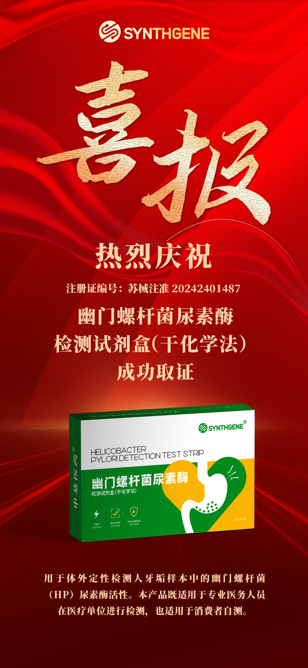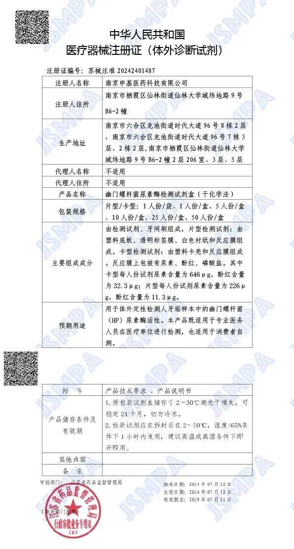 近日,南京申基医药科技有限公司自主研发的“幽门螺杆菌尿素酶检测试剂盒(干化学法) ”成功取得江苏省药品监督管理局颁发的二类医疗器械注册证,注册证编号:苏械注准 20242401487 ,这也是江苏省幽门螺旋杆菌家庭自测试剂盒第一证。用于体外定性检测人牙垢样本中的幽门螺杆菌(HP)尿素酶活性。 本产品既适用于专业医务人员在医疗单位进行检测,也适用于消费者自测。 申基医药幽门螺杆菌检测试剂盒以干化学法为原理,用于人牙垢样本中幽门螺杆菌的定性检测,可在3分钟之内显示检测结果。该产品具有采样简单、方便快速、灵敏性高等优势。适用于口腔幽门螺杆菌的即时诊断。 #产品特点 01居家的自测性 自测取证产品,3min快速检测。 02操作的舒适性 取样简单,采集牙垢。 03人群的适用性 基本无不适用人群。 在推进胃肠道疾病早期防治方面,申基医药持续发力,不断优化和完善其快速检测产品组合。此次获批的幽门螺杆菌尿素酶检测试剂盒 ,将进一步增强公众对于胃癌早期预警与防控的能力,成为守护国民肠胃健康的重要工具。 展望未来,申基医药将继续秉持创新精神,依托严谨的研发体系与高效的生产能力,专注于提供专业级快速诊断产品及慢性病管理服务,致力于为用户提供更为便捷、高质量的家庭健康检测方案,全方位护航国民健康。 淘宝搜索“申基”或扫描下方二维码,进入申基天猫官方旗舰店(synthgene旗舰店),更多健康呵护产品供您选择,选择申基,呵护升级。 选择申基 呵护升级 EMBRACE SYNTHGENE ENHANCE CARE SYNTHGENE 南京申基医药科技有限公司(Nanjing Synthgene Medical Technology Co., Ltd.)是一家聚焦健康科技,围绕家用健康管理事业,覆盖从健康生活、疾病预防、诊断、到家庭关护的健康养护全程,将自身发展与健康生态圈构筑相结合,致力于成为我国家庭健康管理领域的先进企业,不断为人类健康社会保驾护航。 小编观点: 口腔中的HP感染是胃内HP无法根除的主要原因之一,识别和治疗它对于胃部根治十分重要。由于口腔中的Hp能借牙菌斑等来逃避抗生素,加之其微生态环境与胃也不同,胃内HP检测方法会带来差异;南京申基幽门螺杆菌尿素酶检测试剂盒,无创取样,以检测人牙垢,定性样本中的HP尿素酶活性,在为医务人员增添新工具,为家庭自测试剂盒增添一证,等等这些优化检测流程,检测环境产品,对行业有一定的贡献。申基不断完善的快速检测产品组合,能为胃部HP感染根除治疗方案及预后管理添砖加瓦。 |