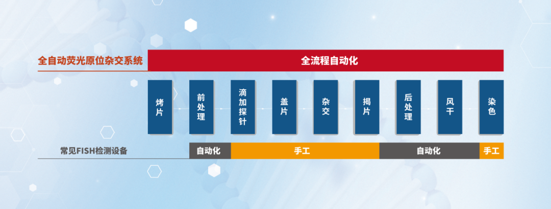 全自动荧光原位杂交系统是一台实现FISH检测前处理(烤片、脱蜡、通透、酶处理、脱水)、变性和杂交、后处理(洗涤、染色)全流程的自动化的FISH检测设备,相较于半自动化的FISH检测设备,它可实现自动化滴加探针、自动化滴加DAPI、自动化盖玻片和自动化揭玻片,彻底解放双手,实现从白片到阅片前的所有FISH步骤自动化完成,全程无须人工干预,且完成所有FISH步骤最快约5小时。 |