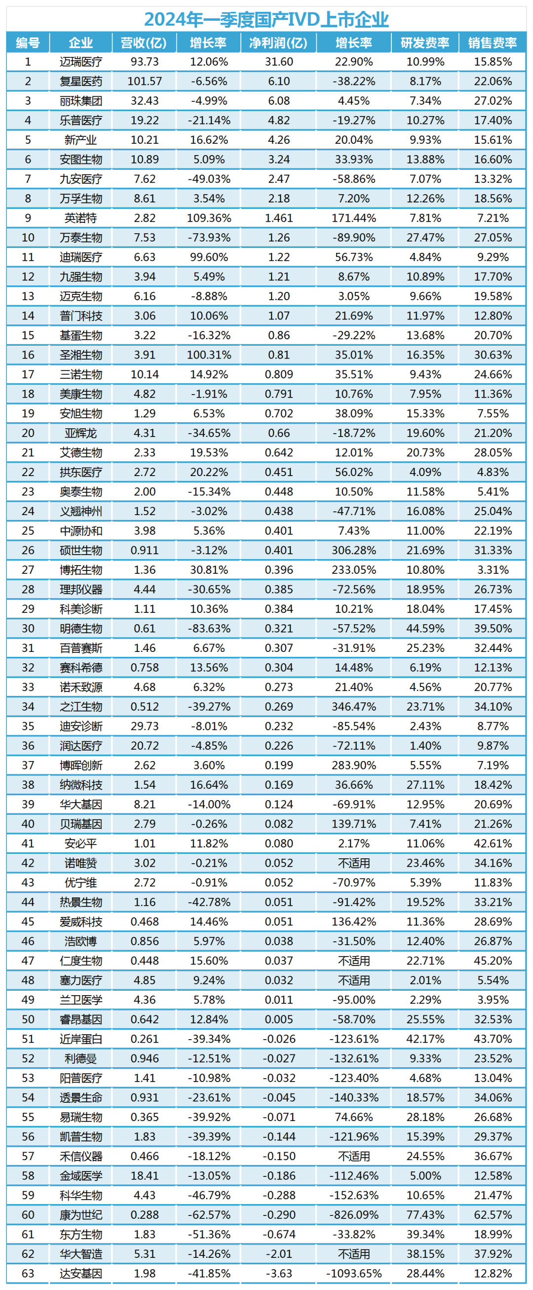 今年以来,国内体外诊断(IVD)领域正在遭遇越来越大的市场竞争和经营管理压力。 近期,北京百康芯生物科技有限公司被纳入被执行人名单并受限高消费。根据相关财产保全申请,法院裁定冻结百康芯(天津)生物科技有限公司、北京百康芯生物科技有限公司名下银行存款共计164,142.63元,或查封、扣押其名下价值相当的其他财产。 除此之外,A股上市的IVD公司,由于企业高管被“一锅端”进一步引发资本市场震动!一日之间,公司的实控人、总经理、副总经理等四名高管均被采取强制措施,股价也一度跌停。 据悉,上海睿昂基因科技股份有限公司(简称“睿昂基因”)不久前发布公告,披露公司实控人、董事长兼总经理熊慧,实控人、董事兼副总经理熊钧,以及副总经理薛愉玮因涉嫌非法经营,被公安机关采取指定居所监视居住措施;而副总经理何俊彦则被刑事拘留。 技术先锋陷困境 企业高层变动业绩波动 如今的IVD行业,正逐渐褪去其“光环”,回归到更加理性与稳健的发展轨道上。这一转变不仅是对行业韧性的考验,也是对企业战略规划、创新能力及市场适应能力的深层次检验。 百康芯是一家专注于分子POCT产品研发与生产的企业,自成立以来,在微流控芯片与配套试剂领域取得了显著的技术突破,拥有超过40项相关专利,专注于核酸检测一体机的研发与生产。 资料显示,百康芯于2018年获批一款恒温仪器,2021年又推出了下呼吸道多联检产品。 新产品取得里程碑,也引起了跨国巨头的关注。2022年5月,丹纳赫旗下投资公司丹纳赫创思进入百康芯股东行列。不过,值得注意的是,这笔投资在短短一年之后,丹纳赫于2023年3月宣布退出。如今,这家专注中国微流控产业发展,曾经备受资本和产业看好的POCT企业面临困境,着实令人唏嘘不已。 另一方面,遭遇企业高管“雪崩”的睿昂基因,成立于2018年12月,由上海睿昂生物技术有限公司变更而来,创始人熊慧。该公司于2021年5月17日在上海证券交易所上市,主要产品包括分子诊断试剂产品和相关科研及检测服务,专注于肿瘤分子诊断试剂的研究与开发。目前,该公司已有多款国内独家产品获批,如淋巴瘤基因重排检测试剂盒、白血病15种融合基因检测试剂盒等。 从营收结构看,2023年,睿昂基因自产试剂营收2.1亿元,贸易试剂营收601万元,科研服务614万元,检测服务2349万元,其中自产试剂和科研服务毛利率均超80%,贸易试剂毛利率也超50%,检测服务毛利率为负值。 对于业务经营受到的考验,睿昂基因方面将业绩表现归因于非核心检测业务收入大幅下降,上海思泰得实验室搬入新场地、投入新设备导至检测服务固定成本上升,检测服务毛利波动较大。 2023年,睿昂基因营收2.58亿元,同比下降39.14%;归属于上市公司股东的净利润793.07万元,同比下降80.41%。而在2022年,睿昂基因实现营业收入4.24亿元,同比增长45.83%。此外,在过去的一年中,睿昂基因的高层管理人员变动也较为频繁。 四成企业净利润大跌 经营业绩持续下行 2024年一季度财报显示,超半数IVD企业营收下滑,部分企业营收更是遭遇“腰斩”。 据不完全统计,63家A股上市IVD企业总营收达到494.10亿元。然而,从营收角度来看,2024年一季度国产IVD企业的整体营收增长态势似乎并未显现。 2024年一季度,IVD行业财报揭示了显著的集中化趋势:营收前五的企业总和达278.18亿元,而其余58家企业营收总和仅为215.92亿元,凸显了行业资源的进一步整合。 值得注意的是,有14家企业一季度营收未破亿,面临严峻挑战。其中,部分疫情期间凭借新冠业务“侥幸”上市的企业,若未能扎实提升核心竞争力,未来恐面临退市风险。 迈瑞持续领跑,安图与新产业的竞争胶着,后者若保持当前增长率,有望在今年第四季度实现营收反超。迈克、亚辉龙虽与前三家差距拉大,但新战略频出,正奋力追赶。 值得注意的是,仅仅迈瑞一家企业的营收,就接近后面60家企业营收的总和。国产IVD企业的集中度确实越来越大了,也就意味着未来中小IVD企业的“淘汰赛”将会加速。 在行业63家企业中,35家一季度营收下滑,占比超五成。其中新冠期间的佼佼者跌幅尤为惨重,如明德暴跌83.63%,万泰下跌73.93%,康为世纪下跌62.57%,东方生物下跌51.36%,九安医疗下跌49.03%。暴跌的企业,几乎无一例外都是新冠期间表现较好的。 与此同时,营收增速最快的三家企业分别是英诺特、圣湘、迪瑞,这三家一季度营收都翻番了,其中英诺特、圣湘可能是受益于呼吸道多联检业务的爆发,迪瑞则主要系大客户开发销售收入增加所致。 有不少企业在2023年一季度还有少量新冠业务,或者将2022年年底的新冠业务计入了2023年一季度财报,这也是导至今年一季度不少企业营收同比大幅下跌的原因之一,不过到第二季度,新冠这块“遮羞布”可能就被彻底扯下来了。 净利润方面,一季度有13家企业亏损,11家净利润低于千万,合计24家企业未能盈利,占比近四成。其中,达安基因亏损最为严重,一季度亏损达3.63亿元,主要源于参股上市公司股价波动。 就一季度净利润增长率而言,28家国产IVD企业出现了下跌,且下跌幅度均超过18.72%,无一企业跌幅在此区间之内,此现象颇显异常。然而,这也从侧面反映出,国产IVD企业普遍具备上进心,除非万不得已,否则都会竭力避免净利润下滑。 值得注意的是,即便净利润未下跌,也并非高枕无忧。在63家企业中,除上述28家净利润下跌的企业外,另有3家陷入亏