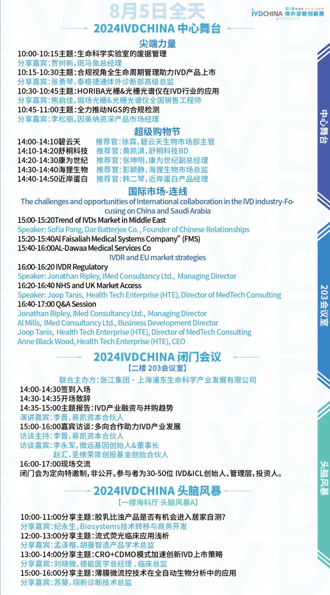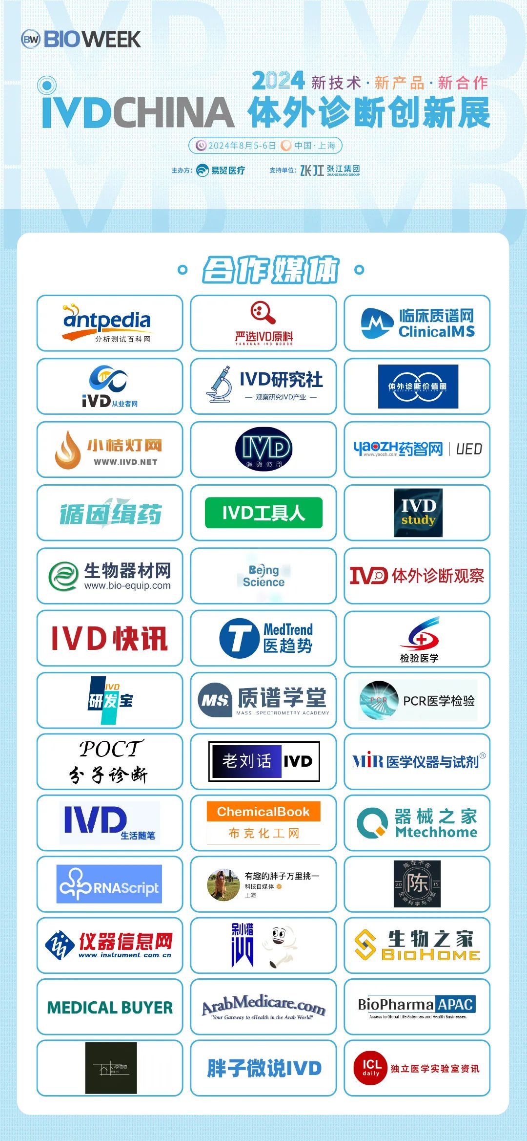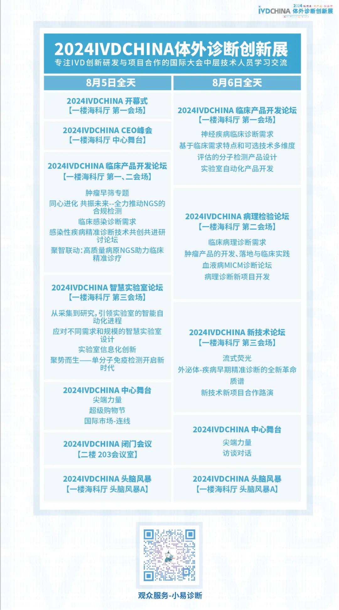 扫码注册大会 参会咨询: @小易诊断13167051807 2024IVDCHINA体外诊断创新展马上就要正式与大家见面啦!展览全程2天(8月5-6日),其中8月5日为开幕日,期待与您现场相见! 签到提醒 01 门票确认 扫描下方二维码,进入个人中心,查看您的签到二维码、门票信息、特邀活动信息。 如您的个人中心页面二维码正常显示且有“未签到”字样,则您的门票注册已生效。 02 签到信息 签到地点:上海张江科学会堂,1楼海科厅前厅 【展商签到】 8月4日 13:00-17:00 【8月5-6日大会与展览】 观众签到: 8月5日 08:00-17:00 8月6日 08:00-15:00 温馨提示:8月5日大会开幕式将于09:00开始 03 资料领取 完成签到后,您可凭代表证领取大会资料(资料有限,先到先得) 04 签到须知 加速入场Tips: 1、 错峰签到:建议您8月4日下午前往上海张江科学会堂一楼海科厅签到,避免8月5日人流拥堵,提前签到更有机会赢取大礼! 2、自助签到:本次大会设有自助签到设备,您可以前往自助签到区操作 05 签到赢好礼 5-6日两天每日早签到,赢取好礼,现场将送出旅行箱、空调毯、玩偶、小易周边等多份好礼,等你来领! 2024IVDCHINA日程 左右滑动查看全日程内容 交通指南 大会地址:上海市张江科学会堂 驾车交通 上海火车站:距离26公里 车程30分钟 上海虹桥火车站:距离40公里 车程40分钟 上海虹桥国际机场:距离37公里 车程40分钟 上海浦东国际机场:距离26公里 车程30分钟 车辆入口: W1号门(可开车驶入地下停车场) 内设地下停车场,收费标准:30分钟免费,超过1小时收费7元,8小时封顶。 地铁交通 地铁13号线学林路3号口,出站后步行600米即可到达 酒店预订 临近会期,我们根据不同价格区间,为大家整理了会场附近的酒店信息,房源紧张,请大家及时预定哦! 下滑浏览完整内容 扫码注册大会 添加@小易诊断 (13167051807) 了解约见及参会服务 部分出席嘉宾 2024IVDCHINA部分参展企业 2024IVDCHINA合作媒体 关于BIOWEEK 由易贸医疗主办,张江集团作为支持单位,联合呈现的BIOWEEK2024将于8月4-10日在上海张江与大家见面,以创新和务实的态度,充分利用上海生物产业资源,和在国际交流中的重要桥梁作用,以技术为出发点,全力打造具有国际影响力的创新技术论坛和展览交流活动。