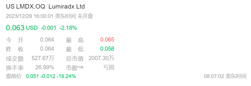 然而出道即巅峰,上市当天LumiraDx 以约30亿美元市值收盘,如今仅剩下2007万美元,每股亏损1.34美元。