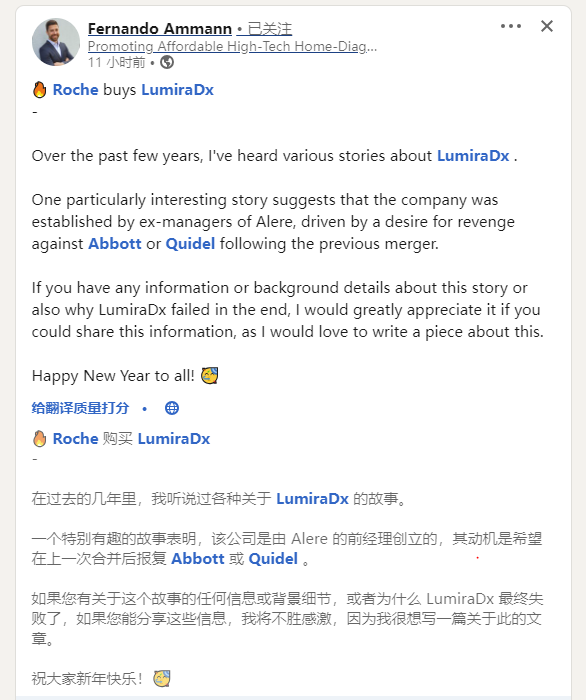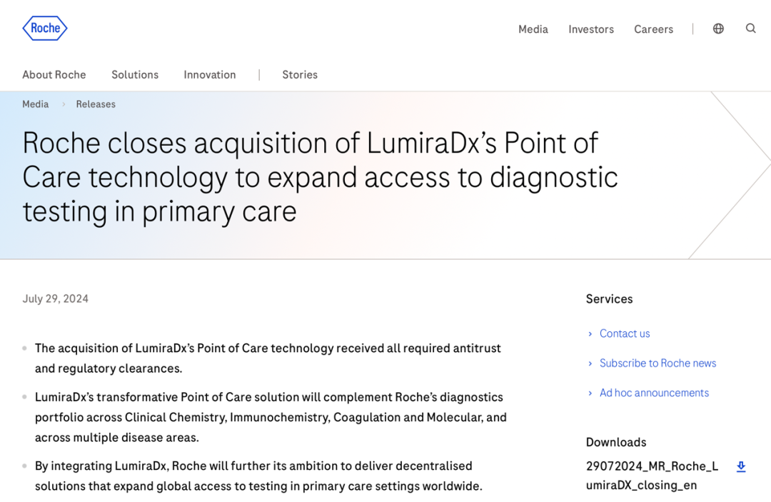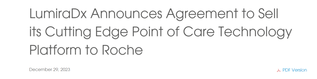 此前,罗氏曾宣布签署协议于2023年底收购LumiraDx的即时检测技术。