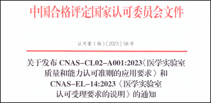 23年八月中国合格评定国家认可委员会发布了关于发布CNAS-CL02-A001:2023《医学实验室质量和能力认可准则的应用要求》和CNAS-EL-14:2023《医学实验室认可受理要求的说明》的通知。通知要求文件于12月1日起正式实施!