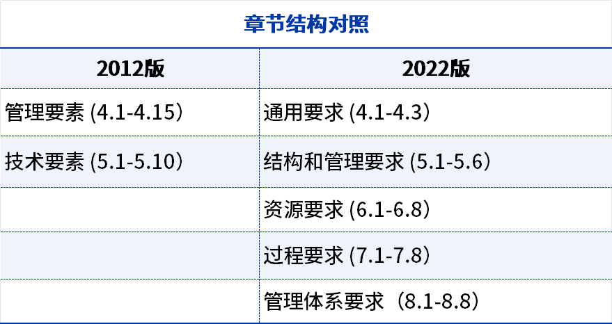 与ISO15189:2012相比,ISO15189:2022的结构发生很大变化,除第1章范围、第2章规范性引用文件和第3章术语定义外,其余章节条款均重新进行了编排。总章节从原来的五章改为八章。