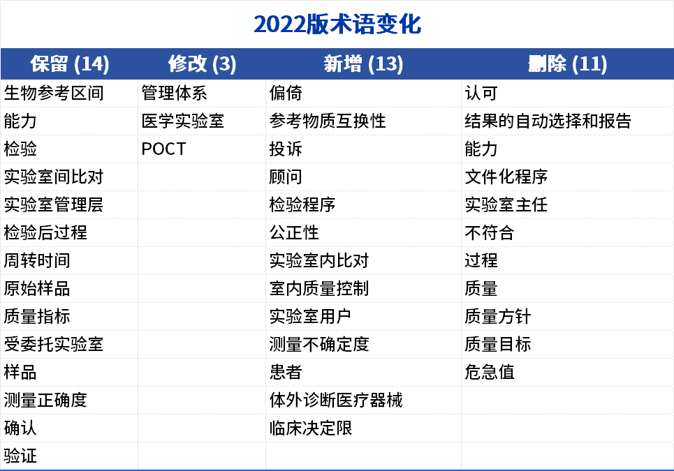不再要求评估不符合的程度,室间质评要求增加包括POCT检验方法,对实验室投诉更加具体明确,新增加“连续性和应急准备计划”条款: