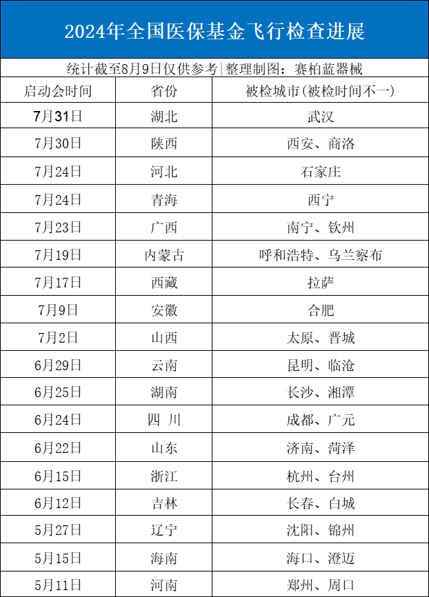 开展审计专项调查 聚焦医药商业贿赂 国家飞检已触到18省 9月底前完成现场检查 据不完全统计,目前国家医保飞检已经触达18省,分别是湖北、陕西、河北、青海、广西、内蒙古、西藏、安徽、山西、云南、湖南、四川、山东、浙江、吉林、辽宁、海南、河南。按照国家医保局工作安排,9月底前其余省份也将陆续开展国家医保飞检工作。 此次甘肃要求要加强定点医药机构相关人员医保支付资格管理,探索“监管到人”的机制。深入开展医保基金违法违规问题专项整治,依托医保大数据筛查分析优势,开展数据共享、联合执法、条线处置、督查督导等综合监管,切实维护医保基金安全。 根据国家6部门发布的《关于开展医保基金违法违规问题专项整治工作的通知》,此次聚焦骨科、血透、心内、检查、检验、康复理疗等重点领域,并邀请最高人民法院加入。按照工作安排,自查自纠已于5月完成,目前处于集中整治阶段,将持续到今年11月。 7月30日,2024年全国深入整治骗取医保基金工作部署会在湖北省武汉市召开。会上提到,要加大曝光力度,增强典型问题曝光的针对性,充分传递对欺诈骗保的“零容忍”态度。 医保整治工作正在分阶段、有步骤地在全国展开。2024下半年,医疗监管的空白地带将不断收缩。 |