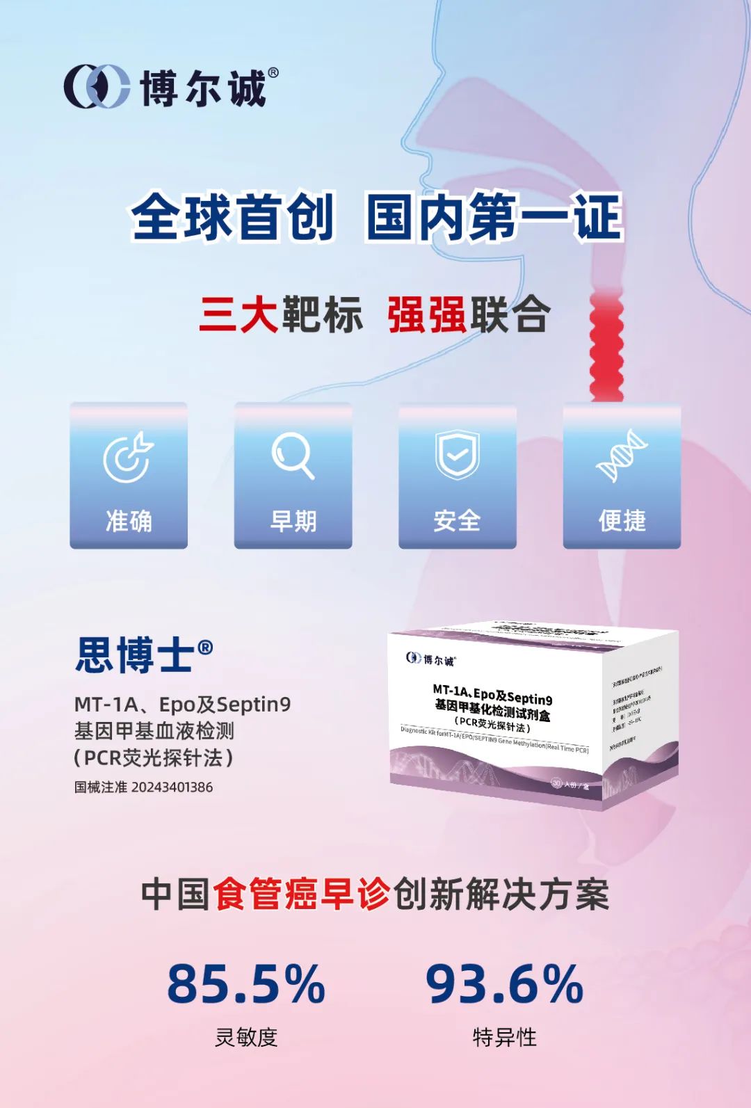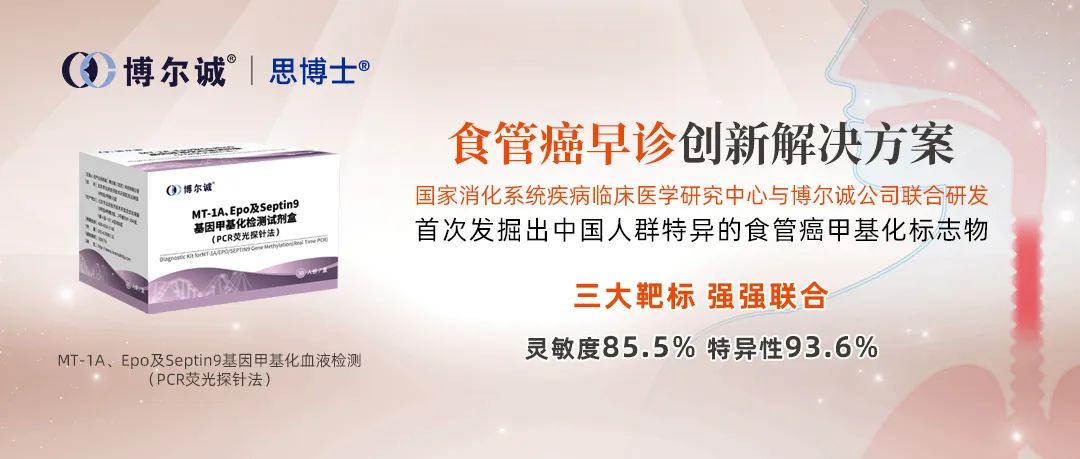 引言 食管癌是中国高发的消化道恶性肿瘤之一,侵袭性强、易迁移、预后差,中晚期患者5年生存率仅为15%-25%。根据国家癌症中心2022年数据,我国食管癌新发人数22.4万、死亡人数18.8万,发病率和死亡率相比于全球和亚洲地区均处于较高水平;发病人群呈现地域性,河南、河北、山西沿太行山一带显著高发。目前我国临床上早期食管癌检出率很低,严重影响患者远期生存。 《食管癌诊疗指南(2022年版)》中强调了食管癌早诊早治的必要性以及早筛是降低食管癌死亡率的关键。国家消化系统疾病临床医学研究中心(西安)和博尔诚(北京)科技有限公司联合研发的全球首款食管癌基因甲基化早诊产品——思博士®MT-1A、Epo及Septin9基因甲基化检测试剂盒(PCR荧光探针法)(以下简称“思博士®”),为食管癌早筛早诊提供了全新的解决方案。 食管癌的危险因素主要包含环境、遗传和吸食烟酒等,早期通常无症状,部分患者会出现吞咽困难或突然体重减轻症状。早期食管癌治愈率高达95%,是黄金诊治期。但由于早期食管癌难察觉,大多数人在确诊时已经是中晚期,失去了根治性的机会。 目前临床上的食管癌检测方式,如内镜检查或传统肿瘤标志物检测均存在一定局限性。首先,医师资源匮乏问题尤为突出。以北京某大型三甲医院为例,消化科医生每天需要接待超过100名患者,而每位医生每天能进行的内镜检查数量有限,这导至了大量患者需要排队等待,甚至错过最佳筛查时间。据国家卫健委2022年中国医师资源报告统计,全国内镜医师缺口高达30,000人 ,很大程度上制约了早期筛查的推广。 其次,患者依从性低也是一大难题。内镜检查是一种侵入性操作,需要患者空腹并进行复杂的检查前准备,部分还需要麻醉,这让很多人产生恐惧和抗拒心理。根据某省级医院内部统计数据,尽管有30%的高危人群被建议进行内镜检查,最终实际接受检查的仅有15% ,这种低配合度直接影响了食管癌早发现、早诊断、早干预的效果。 此外,传统肿瘤标志物检测灵敏度不高,难以有效发现早期病变。《临床肿瘤学杂志》2021年发表的关于食管癌标志物检测灵敏度研究显示,传统标志物如CEA和SCC在食管癌早期检出率不足30%。 这意味着,依赖这些传统检测手段,很多早期食管癌病例无法被及时发现和处理,延误了治疗时机。所以,亟待新的检测手段来弥补这些不足。 我们知道,解决癌症的根本性办法是早发现、早诊断、早干预。癌细胞中的DNA异常甲基化贯穿于癌症发生和发展的全过程,所以DNA甲基化标志物是身体的“晴雨表”。 思博士® 是全球首创、国内第一证的重磅新品。该试剂盒由国家消化系统疾病临床医学研究中心(西安)和博尔诚(北京)科技有限公司联合研发,是国家“十三五”重点研发计划的课题任务,拥有13项专利,填补了国际国内在食管癌基因甲基化标志物早诊领域的空白。该试剂盒基于全球领先的ctDNA液体活检技术,首次发掘出可用于食管癌检测的中国人群特异的三个基因甲基化标志物(MT-1A、Epo及Septin9基因),仅需一管5ml血液即可检测。思博士®通过捕获血液中肿瘤细胞凋亡、坏死以及主动分泌所释放的MT-1A、Epo和Septin9基因片段,检测其甲基化水平的变化,能够在食管癌癌前病变及早期癌症阶段发现风险信号,真正实现早发现、早诊断、早干预。 思博士® 在中国医学科学院肿瘤医院、中国人民解放军空军军医大学西京医院、中国人民解放军空军军医大学唐都医院、河南省肿瘤医院、西安交通大学第二附属医院和汕头大学医学院附属肿瘤医院6家权威医院进行了多中心、大样本量、前瞻和回顾结合的临床试验。试验共入组954例受试者,采用试验用体外诊断试剂与食管癌临床参考金标准进行比较研究,对产品临床性能进行评价。试验结果表明,思博士®临床特异性为93.6%,整体灵敏度为85.5%,其中0期灵敏度为56.3%,I期灵敏度为77.4%;此外,临床试验还纳入239例疑似食管癌病例,采用试验体外诊断试剂与一代测序方法进行比较研究,结果显示思博士®针对MT-1A、Epo、Septin9基因检测,总体符合率分别为99.6%、99.2%和100%。 综上,我们可以看到思博士®在灵敏度、特异性及总体符合率方面均达到了优异的性能,体现了卓越的临床检测性能和产品前瞻性。这些权威临床机构的参与不仅确保了试验的严谨性和科学性,还为产品提供了重要的临床背书,增强了产品的市场信任度和竞争力。该试剂盒适用于医院的检验科、病理科、体检科、胸外科、肿瘤外科、消化内科等多个科室以及第三方医学检验机构和体检机构等,在临床应用中具有广泛的适用性和广阔的检测需求。 博尔诚公司是首个将基因甲基化检测技术引入中国的企业,推动了结直肠癌早期检测和筛查技术在国内的发展。因其具有非侵入性、便捷性、高效性、可及性等优势,使得许多三甲医院、第三方医学检验机构、体检机构等都采用这一技术进行结直肠癌的早筛早诊。 此后,博尔诚进一步丰富了甲基化检测产品线(思博系列),结直肠癌早诊产品思博定®、胃癌早诊产品思博卫®、刚刚获批上市的食管癌早诊产品思博士®、已进入临床试验阶段的肝癌早诊产品思博甘®等多款产品,可提供高发消化系统癌症早诊的一站式解决方案。其中,结直肠癌、胃癌血液基因甲基化检测已在全国超300家三甲医院中广泛应用,并纳入多个地区的医保体系(食管癌血液基因甲基