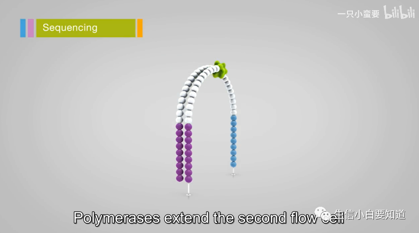 在 lane 的内表面其实做了专门的化学修饰,主要有用 2 种不同的寡聚核苷酸引物,它们被种在 flowcell 的表面,也就是我们前面提到的 flowcell oligo,它们会与 DNA 片段上的 P5 和 P7 适配器序列结合,使即将被测序的 DNA 片段可以被固定在 flowcell 上。图中的一个小圆球就代表一个碱基, 它们是通过共价键连接到 flowcell 上的。