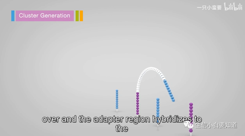 红色框框中的这条就是模板链,我们可以看到这条链一端的接头与 flowcell 上与其互补配对的引物(其中一种)进行杂交。