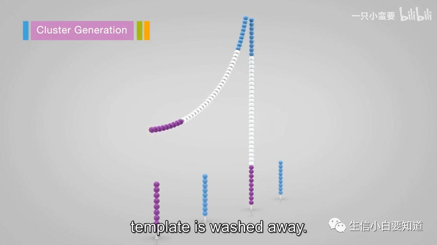 接下来,就是把合成的双链变成可以测序的单链,它使用的办法就是通过一个化学反应把其中一个引物上的一个特定基团给切掉。