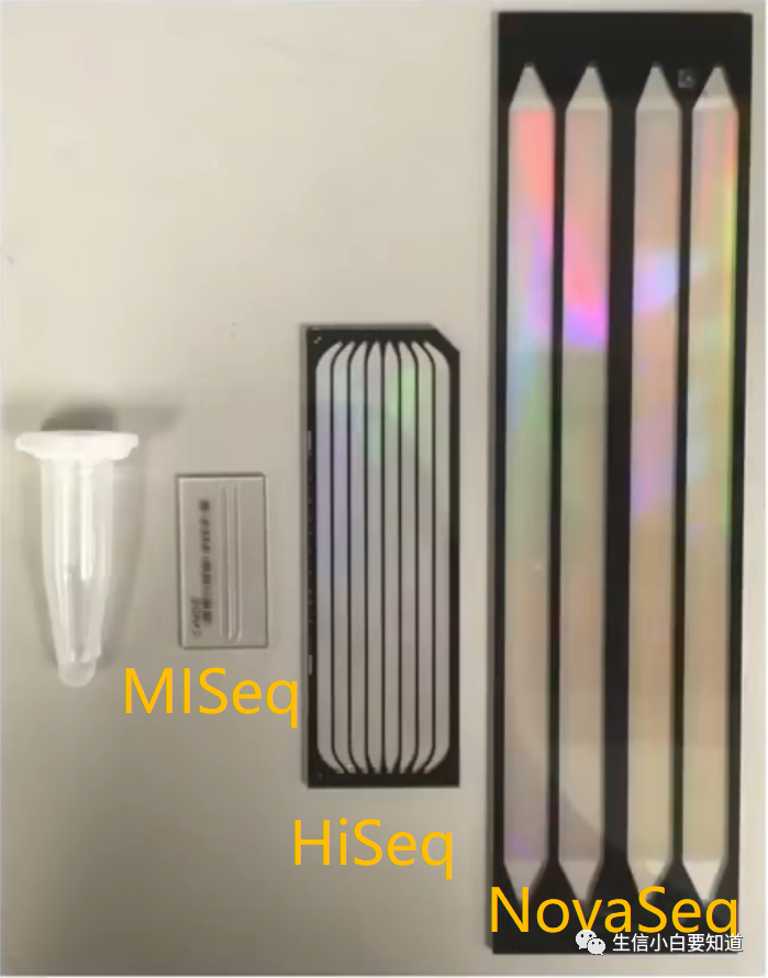 下面这张图展示的是几个不同的 flowcell。最左边的是 EP 管,大家可以以它为参照,大概了解一下不同 flowcell 的大小。