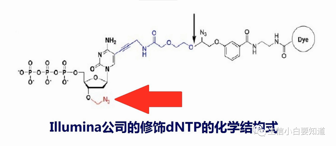 dNTP 的 3’ 末端连接了一个叠氮基团,这个叠氮基团在链延伸的时侯起到了阻止聚合的作用,所以一个循环只能延长一个碱基(这就是传说中的荧光修饰dNTP、可逆合成终止,Illumina测序的最核心技术)。