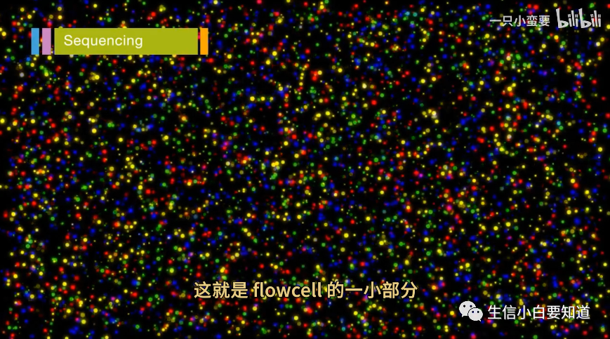 在大规模并行的过程中,数以千万计的簇被测序。上图仅代表整个 flowcell 中的一小部分。