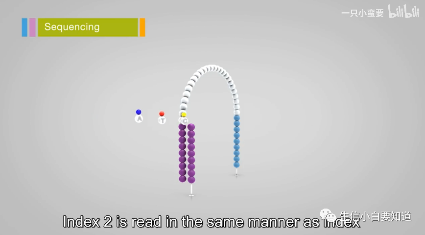 那么,要读取这个 index1 序列(为什么叫 index1?因为后面还有 index2!),首先把上面测完的读段产物洗掉,然后加入 index1 的测序引物,它结合的位点呢,正好就在这个 index1 序列的旁边,接下来进行第二轮测序,一般读 6-8 个碱基,这段读出来我们就可以知道这个片段来源于哪个样本啦!