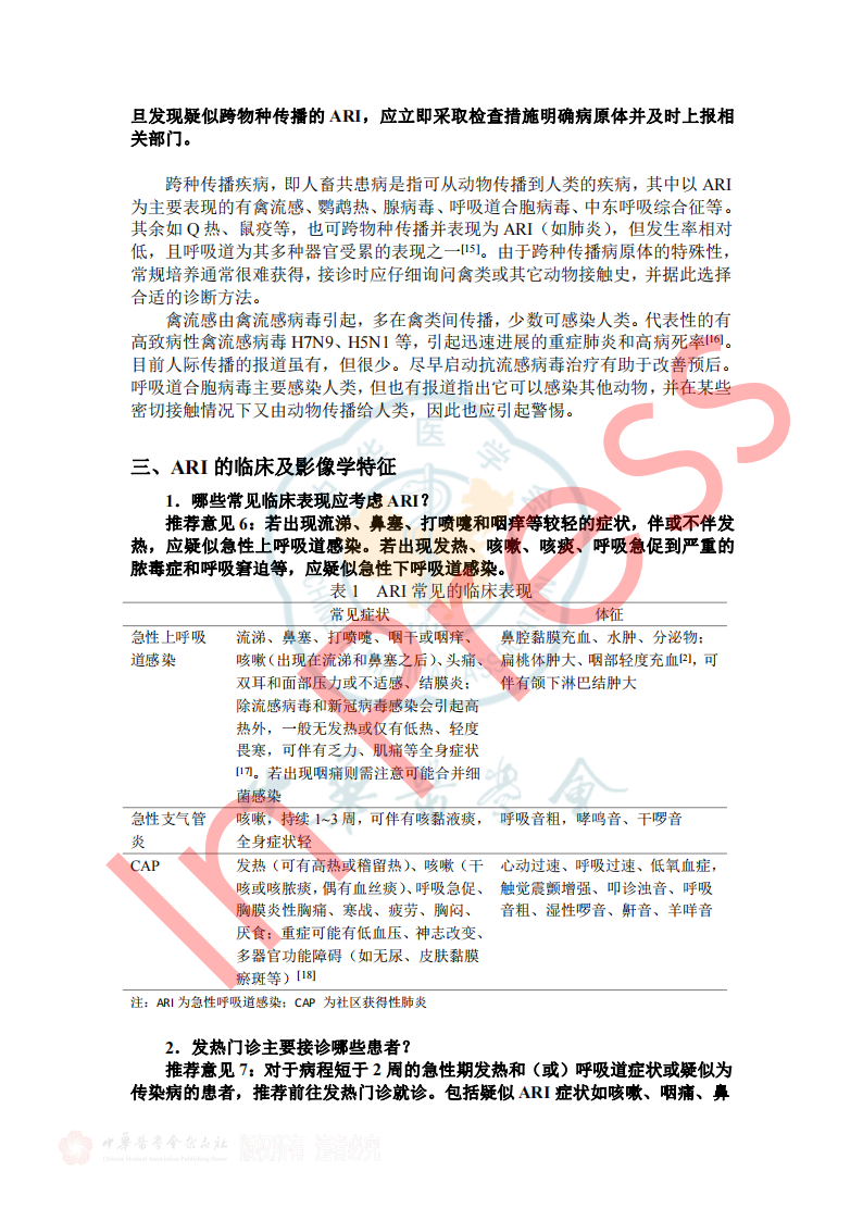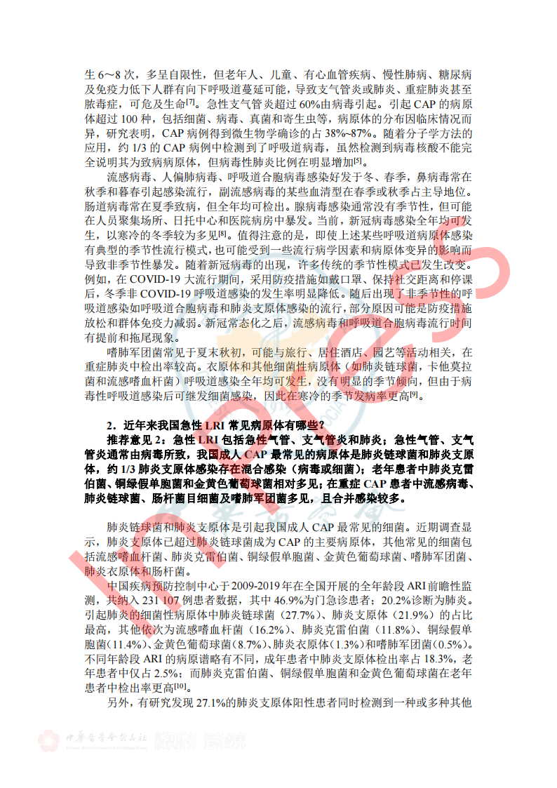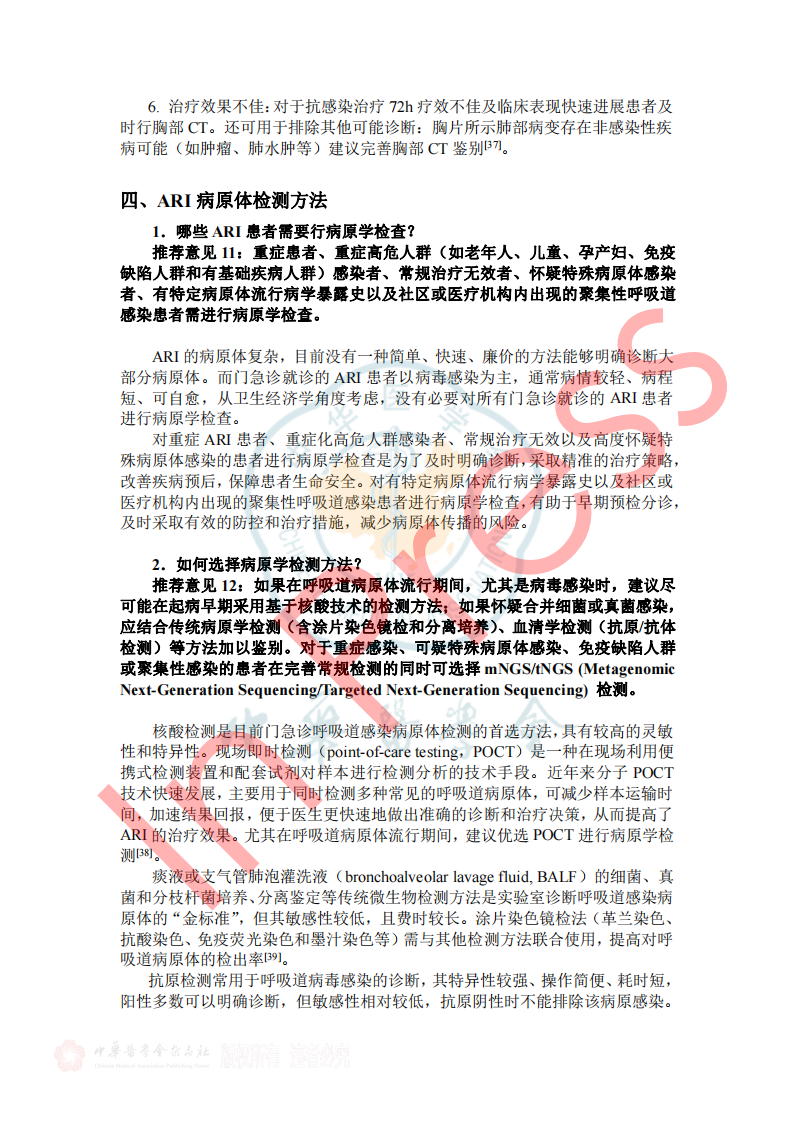 2024年7月26日《成人门急诊急性呼吸道感染诊治与防控专家共识》于中华传染病杂志42卷在线发表,本共识由全球华人临床微生物暨感染学会邀请我国感染、呼吸、临床微生物学和医院感染管理等领域的专家,结合国内、外的相关文献,共同编写和制定,针对急性呼吸道感染的病原学、流行病学、临床及影像学特征、病原检测方法、治疗、预防与控制等方面,基于循证证据,总结出23条建议,供临床参考借鉴,以提高医生对疾病的认识,优化诊治及感控策略和门诊就诊流程。(原文见文末) 急性呼吸道感染(Acute respiratory infection,ARI)指各种病原体引起任何呼吸道症状急性发作的临床急性病(通常病程不超过21天),主要症状包括咳嗽、咳痰、呼吸急促、咽喉痛、流涕 。ARI主要包括急性上呼吸道感染、急性支气管炎和社区获得性肺炎(community-acquired pneumonia,CAP),常见致病微生物为病毒和细菌(含不典型病原体)。 一、ARI的流行病学 1.不同季节我们应关注哪些ARI病原体? 推荐意见1:冬春季应重点关注流感病毒、鼻病毒、人偏肺病毒、呼吸道合胞病毒;COVID-19 尚未形成明显季节流行规律,全年均可发生,以寒冷的冬季较为多见;腺病毒感染通常没有季节性,但在人员群聚场所、日托中心和医院病房中应予以关注;嗜肺军团菌常见于夏末秋初,其他细菌真菌感染通常无明显季节性。 2.近年来我国急性LRI常见病原体有哪些? 推荐意见2:急性下呼吸道感染(lower respiratory infection,LRI)包括急性气管、支气管炎和肺炎;急性气管、支气管炎通常由病毒所致,我国成人CAP最常见的病原体是肺炎链球菌和肺炎支原体,约1/3肺炎支原体感染存在混合感染(病毒或细菌);老年患者中肺炎克雷伯菌、铜绿假单胞菌和金黄色葡萄球菌相对多见;在重症CAP患者中流感病毒、肺炎链球菌、肠杆菌目细菌及嗜肺军团菌多见,且合并感染较多。 4.哪些细菌性ARI可在人际间传播或引起聚集性发病? 推荐意见4:应警惕肺炎支原体、百日咳鲍特菌、溶血性链球菌(猩红热)在人际间传播或引起聚集性感染。目前无证据表明军团菌、肺炎链球菌可造成人际间传播。 5.需警惕哪些跨物种传播的ARI病原体? 推荐意见5:接诊ARI患者时应关注跨物种传播疾病如禽流感、鹦鹉热等,注意询问动物接触史(尤其是禽类、野生动物)、旅行史(尤其野外环境)。一旦发现疑似跨物种传播的ARI,应立即采取检查措施明确病原体并及时上报相关部门。 二、ARI的临床及影像学特征 1.哪些常见临床表现应考虑ARI? 推荐意见6:若出现流涕、鼻塞、打喷嚏和咽痒等较轻的症状,伴或不伴发热,应疑似急性上呼吸道感染。若出现发热、咳嗽、咳痰、呼吸急促到严重的脓毒症和呼吸窘迫等,应疑似急性下呼吸道感染。 表1 ARI常见的临床表现 3.如何通过问诊和常规检验初步评估ARI病原体? 推荐意见8:出现ARI相关症状时,在病毒流行期间、聚集性发病或有相关暴露的情况下,需怀疑病毒感染。而咳黄痰、白细胞、中性粒细胞计数或降钙素原升高时,则应考虑细菌或合并细菌感染。 4.如何识别有重症化倾向的患者? 推荐意见9: ①老年人(≥65岁)、妊娠期妇女、体重过轻或肥胖(BMI<18.5或>30)、长期吸烟者、糖尿病、重要脏器慢性病(如心、肺、肝、肾等)、恶性肿瘤中晚期患者和免疫缺陷人群(长期服用激素或免疫抑制剂、HIV感染、器官移植患者)是ARI重症化的危险人群。 ②氧饱和度(<93%)及常用的早期风险预警评分工具CRB-65 (Confusion, Respiratory rate, Blood pressure, and age≥65)、CURB-65 (Confusion, Urea, Respiratory rate, Blood pressure, and age≥65)可用于门急诊识别非免疫缺陷基础的成人重症ARI高风险患者。 三、ARI病原体检测方法 1.哪些ARI患者需要行病原学检查? 推荐意见11:重症患者、重症高危人群(如老年人、儿童、孕产妇、免疫缺陷人群和有基础疾病人群)感染者、常规治疗无效者、怀疑特殊病原体感染者、有特定病原体流行病学暴露史以及社区或医疗机构内出现的聚集性呼吸道感染患者需进行病原学检查。 2.如何选择病原学检测方法? 推荐意见12:如果在呼吸道病原体流行期间,尤其是病毒感染时,建议尽可能在起病早期采用基于核酸技术的检测方法;如果怀疑合并细菌或真菌感染,应结合传统病原学检测(含涂片染色镜检和分离培养)、血清学检测(抗原/抗体检测)等方法加以鉴别。对于重症感染、可疑特殊病原体感染、免疫缺陷人群或聚集性感染的患者在完善常规检测的同时可选择mNGS/tNGS (Metagenomic Next-Generation Sequencing/Targeted Next-Generation Sequencing)检测。