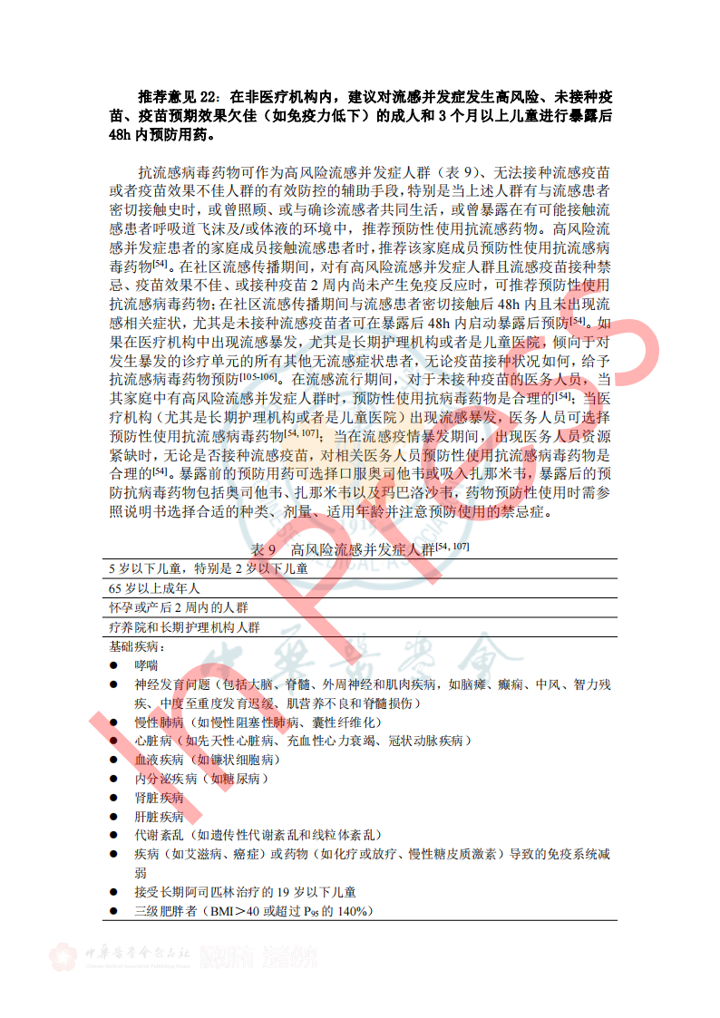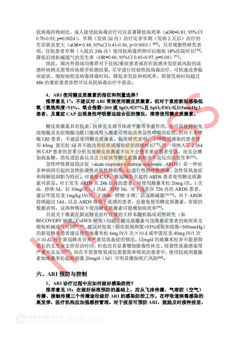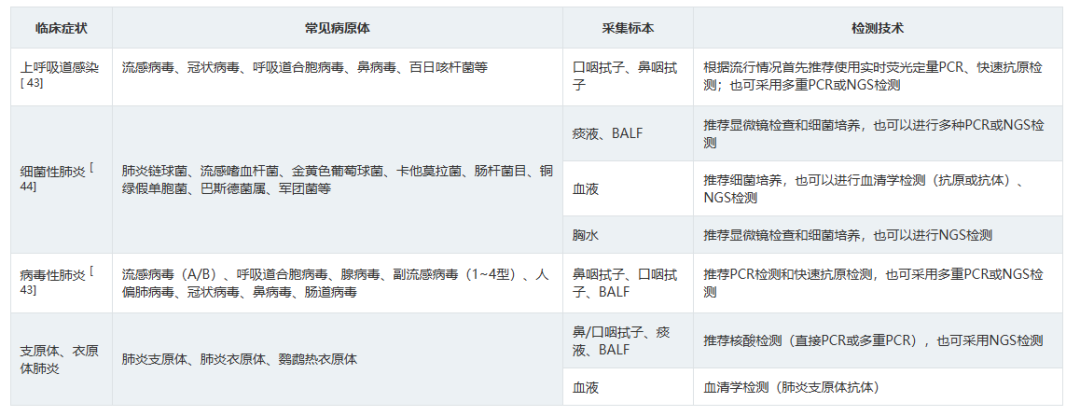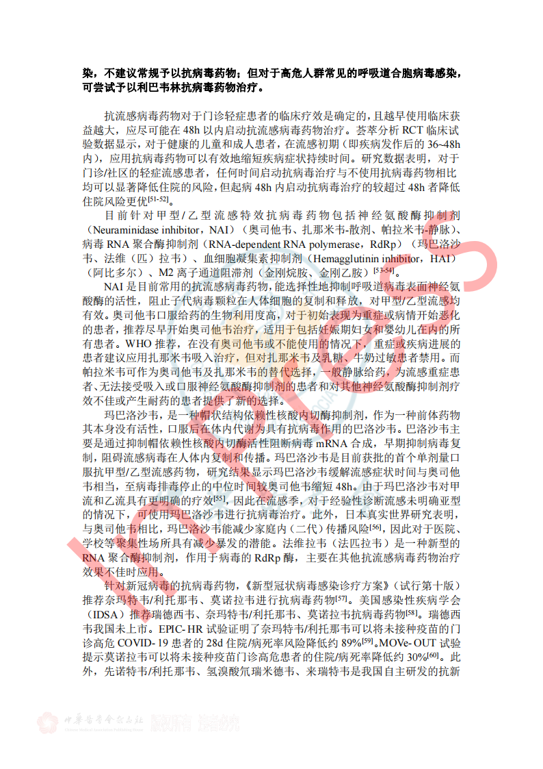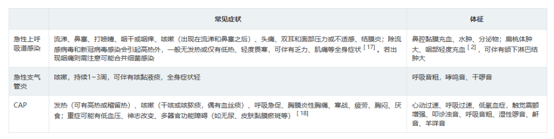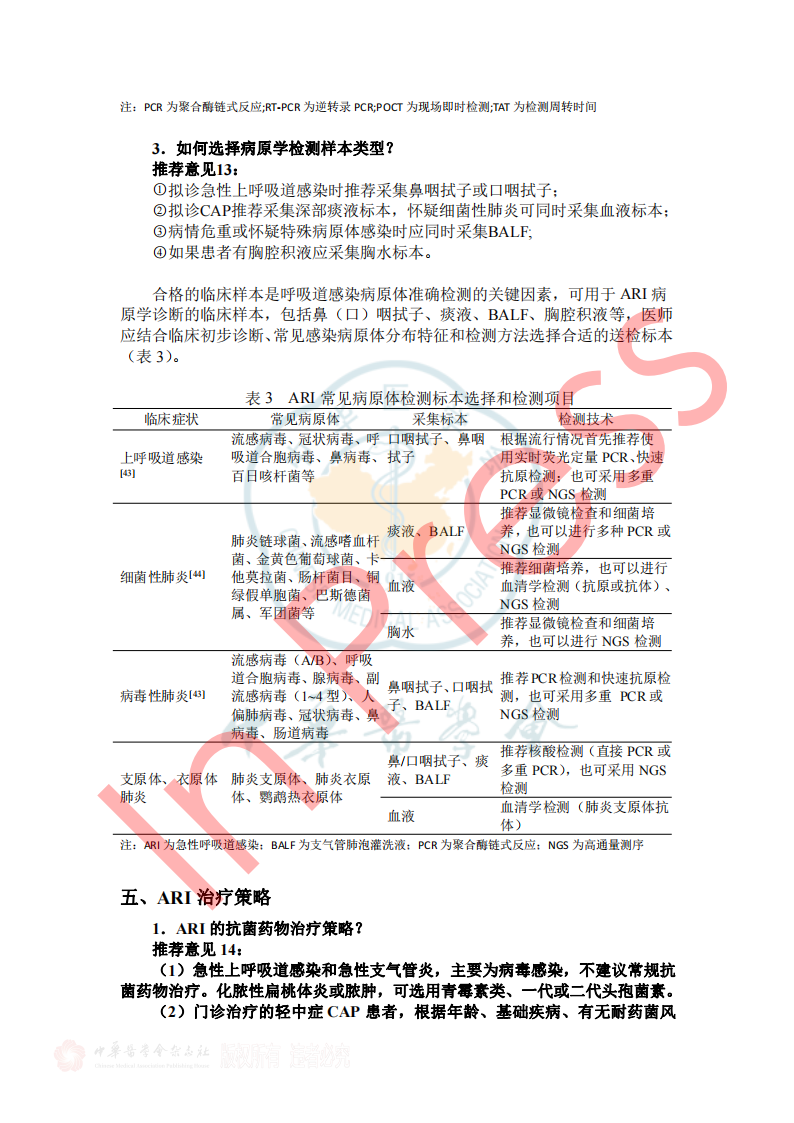 表2呼吸道病原体分子生物学检测方法比较 3.如何选择病原学检测样本类型? 推荐意见13: ①拟诊急性上呼吸道感染时推荐采集鼻咽拭子或口咽拭子; ②拟诊CAP推荐采集深部痰液标本,怀疑细菌性肺炎可同时采集血液标本; ③病情危重或怀疑特殊病原体感染时应同时采集BALF; ④如果患者有胸腔积液应采集胸水标本。 表3 ARI常见病原体检测标本选择和检测项目 四、ARI治疗策略 1.ARI的抗菌药物治疗策略? 推荐意见14: (1)急性上呼吸道感染和急性支气管炎,主要为病毒感染,不建议常规抗菌药物治疗。化脓性扁桃体炎或脓肿,可选用青霉素类、一代或二代头孢菌素。 (2)门诊治疗的 轻中症CAP患者, 根据年龄、基础疾病、有无耐药菌风险等,口服或静脉用抗菌药物,包括 阿莫西林、阿莫西林/克拉维酸、头孢菌素联合大环内酯类或多西(米诺)环素,也可呼吸喹诺酮类单药。 2.常用病毒性ARI的药物及方案选择? 推荐意见15: ①建议确诊流感病毒感染患者早期(48h内)进行抗病毒治疗,神经氨酸酶抑制剂和病毒RNA聚合酶抑制剂对目前流行的甲型和乙型流感病毒具有良好的效果和安全性,根据患者情况选择合适抗病毒药物。 ②建议确诊新型冠状病毒感染患者早期进行抗病毒治疗,药物可选择先诺特韦/利托那韦、奈玛特韦/利托那韦、氢溴酸氘瑞米德韦、莫诺拉韦、来瑞特韦,结合患者病情选择合适的抗病毒治疗药物。 ③除了新型冠状病毒和流行性感冒病毒,对于非高危人群的呼吸道病毒感染,不建议常规予以抗病毒药物;但对于高危人群常见的呼吸道合胞病毒感染,可尝试予以利巴韦林抗病毒药物治疗。 表5呼吸道病毒感染治疗常用药物介绍 五、ARI预防与控制 3.如何判断ARI病原体的传播能力? 推荐意见20:引起ARI的病毒通常较细菌具有更强的传播能力,症状较重的患者传染性更强,发病初期病原体致病性较强,传染性也最强。多种ARI病原体在发病前就已经具备了传染性,因此临床诊治中需询问流行病学史,如患者家庭聚集及发病情况等,及时给予防治建议。 表7 引起ARI常见病原体的潜伏期、传染期和隔离时间 小结 急性呼吸道感染在临床中极为常见,通常病情较轻、预后良好,但重症患者的住院率和病死率会显著升高。因此,早期识别重症感染、及时诊治及早期预防,具有重要临床价值及意义。 需进行病原学检查患者群体