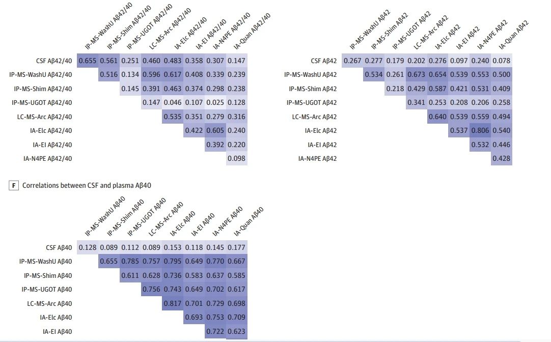使用多种方法测量血浆和CSF中Aβ42和Aβ40的浓度,包括华盛顿大学开发的免疫沉淀-质谱法(IP-MS-WashU)、Araclon开发的无抗体液相色谱-质谱法(LC-MS-Arc)、罗氏诊断的免疫测定法(IA-Elc)、Euroimmun的免疫测定法(IA-EI)、阿姆斯特丹大学医学中心等开发的N4PE Simoa免疫测定法(IA-N4PE)、岛津开发的基于IP-MS的方法(IP-MS-Shim)、哥德堡大学开发的基于IP-MS的方法(IP-MS-UGOT)以及Quanterix的另一种Simoa免疫测定法(IA-Quan)。 主要结果是评价使用8种不同的检测方法量化的血浆Aβ42/40对CSF Aβ42/40和Aβ-PET状态异常的鉴别准确性。
