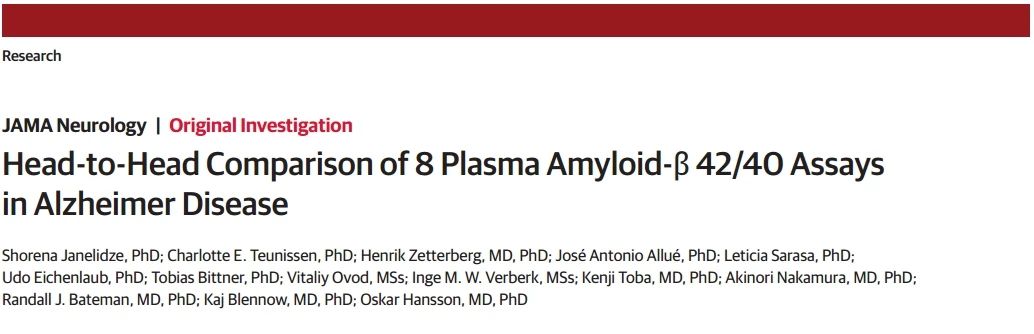 基于血液的阿尔茨海默症(AD)淀粉样蛋白β(Aβ)病理检测对于临床护理中广泛应用AD生物标志物以及促进临床试验中患者筛查和治疗反应监测至关重要。不同Aβ检测方法和平台的性能存在差异,可能与队列特征和样本处理的差异有关。 文章速递 来自瑞典隆德大学马尔默临床科学系临床记忆研究所的专家开展了一项队列研究,旨在比较使用8种不同的Aβ检测方法测量的血浆Aβ42/40在检测早期AD患者脑部Aβ异常状态时的表现。结果发表在JAMA Neurology杂志上。 研究选取了瑞典BioFINDER队列的286名个体,包括182名认知功能正常的老年人和104名轻度认知障碍(MCI)患者。此外,还纳入了来自阿尔茨海默病神经影像学计划(ADNI)的122名参与者,包括51名认知功能正常者、51名MCI患者和20名AD痴呆患者。