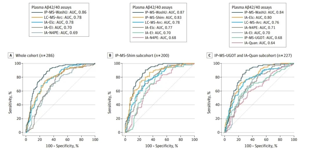 在ADNI队列中,IP-MS-WashU Aβ42/40也表现出比IP-MS-UGOT、IA-Elc、IA-N4PE和IA-Quan更好的性能。