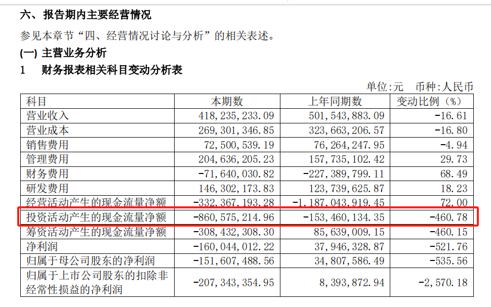 从其财务报表可知,其投资活动产生的现金流量净额为-8.60亿,相比去年同期-1.53亿,变动比例-460%。