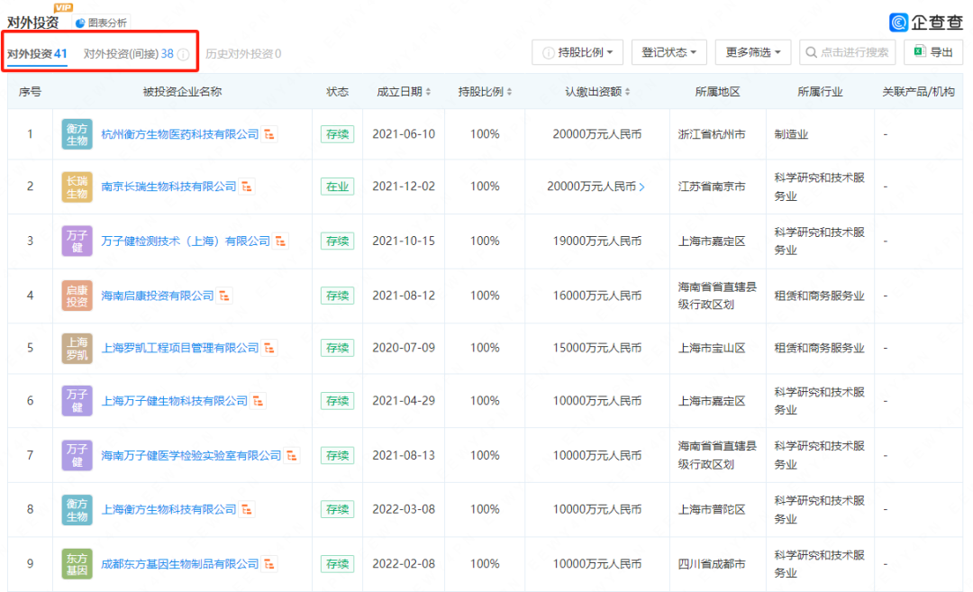 从投资力度上来看,东方生物的策略还是非常激进的,对外投资41项,间接对外投资也有38项。
