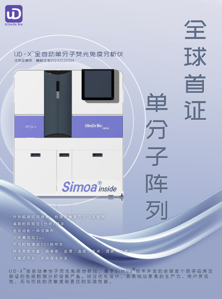 其核心产品UD-X™全自动单分子荧光免疫分析仪成功获批医疗器械注册证(注册证编号:冀械注准20242220334),现已正式上市!UD-X™全自动单分子荧光免疫分析仪将与即将获批的配套检测试剂盒联合使用,旨在满足临床诊断及社区筛查中对各类体液样本中痕量蛋白标志物进行飞克级别灵敏度定性及定量检测的需求。 UD-X™全自动单分子荧光免疫分析仪的成功研发、获批与临床应用,将极大助力阿尔茨海默病(AD)的早期筛查、早期诊断及用药指导,具有重要的临床价值和社会意义。怀揣着对行业的热忱与对患者的深切关怀,依托UD-X™全自动单分子荧光免疫分析平台及标志物定量检测试剂产品,未来,优抵生物将继续提升自身研发及生产能力,保持与各方的通力合作,推动在疾病筛查及辅助精准诊断产品、服务及多维应用平台领域的持续创新与发展,与广大同仁携手共进,共同推动行业发展,为疾病的早期诊断贡献一份力量,共同构建更健康、更美好的世界。 产品发布 2024年8月25日,UD-X™全自动单分子荧光免疫分析仪揭幕仪式在优抵生物公司内举行,优抵生物创始人、董事长及CEO董增军先生在仪式上发表致辞。发布会吸引了众多行业内外人士的关注与瞩目,同时各界专家们也高度认可了单分子阵列技术已经在学术及临床科研方面所表现出的卓越性能,对优抵生物刚刚获批的UD-X™全自动单分子荧光免疫分析仪未来在阿尔茨海默病等疾病早期筛查与诊断中的广阔应用前景表达了殷切期待。 同日,优抵生物还十分荣幸地邀请到中国科学院院士、美国国家科学院外籍院士、英国皇家学会外籍院士高福院士,中国科学院院士、中国科学院上海生命科学研究院研究员徐国良院士,复旦大学附属华山医院神经内科副主任、复旦大学神经病学研究所常务副所长、中华医学会神经病学分会青年委员会副主任委员郁金泰教授,以及首都医科大学宣武医院临床样本中心主任、国家神经疾病医学中心重点项目部副主任蔡燕宁教授等专家学者莅临公司参观、学习与指导,详细了解了公司的生产工艺流程、质量控制体系以及产品研发进展,并就精准医学检测技术的前沿问题展开探讨。专家们指出,随着人口老龄化的加剧,阿尔茨海默病的发病率逐年上升,给患者、患者家庭及社会带来了沉重的负担。因此,加强该领域的基础理论研究与临床应用转化,是当前临床端与企业端的共同的重要任务与社会责任之一。 随后,全体受邀专家就“疾病早期检测与诊断的机遇和前景”这一主题进行了探索,并达成共识:以阿尔茨海默病为代表的疾病早期诊断及就诊率较低这一现象,主要原因在于(1)患者对疾病的认知不足;(2)目前临床上用于早诊早治的手段尚显匮乏;(3)疾病早诊率同时与社会各宏观方面的发展进步密切相关。 专家观点 中国科学院院士、美国国家科学院外籍院士、英国皇家学会外籍院士高福院士强调: “精准诊断是精准医学的基石,精准医学的核心在于精准的诊断。”同时,高院士对优抵生物在阿尔茨海默病精准诊断临床产品开发方面所付出的努力以及所取得的阶段性成果给予了高度评价。 中国科学院院士、中国科学院上海生命科学研究院研究员徐国良院士指出: “精准医疗的基石在于深入的基础研究,若基础研究不够深入,技术和药物的开发将举步维艰。”他进一步强调:“科学研究成果也要依赖于临床与企业的转化,最终达到造福人类的目的。” 复旦大学附属华山医院神经内科副主任、复旦大学神经病学研究所常务副所长、中华医学会神经病学分会青年委员会副主任委员郁金泰教授 对AD的精准诊断进行了深入的探讨。他明确指出AD早期诊断面临的主要挑战,并强调一旦患者进入痴呆阶段,现有治疗手段效果有限,因此早期发现与干预对延缓病程发展至关重要。在探讨AD早期诊断方法时,郁金泰教授特别强调了血浆生物标志物检测的应用前景,血浆生物标志物检测是应对大规模人群诊断挑战的有效手段。 首都医科大学宣武医院临床样本中心主任、国家神经疾病医学中心重点项目部副主任蔡燕宁教授 着重阐述了临床样本规范化与标准化管理的重要性。他提出,企业应更加重视样本质量,并建立全周期的规范化流程,以确保精准医学的顺利转化与应用。 北京协和医学院、北京大学、北京中医药大学博士生导师、中日友好医院前副院长、精准医学专委会主委姚树坤教授 就AD和血管性痴呆的共性与特性与郁金泰教授展开学术讨论后表示,“作为临床端,希望携手科研与企业,多方共同 行业声音 世界知名基金ARCH共同创始人兼管理合伙人Keith Crandell表示:“我们对使用Simoa在中国进行AD和其他疾病的早期诊断感到非常兴奋并充满信心。我们全力投入资金和资源,将突破性技术转化为研究和诊断的产品及解决方案,以帮助世界各地的患者及其家人。” 广发投资香港执行董事麦小颖女士表示:“我们对这项技术及其潜力感到兴奋,并且对董总的激情、活力和领导力印象深刻。广发香港全力支持这个能够为AD早诊这一巨大的蓝海市场提供解决方案的公司,并希望患者很快受益于这项技术。” Quanterix公司CEO(首席执行官)Masoud Toloue博士表示:“我们相信早期检测是疾病治疗的重要起点。如果不借助超高灵敏度的Simoa技术,很多血液中的AD生物标志物是无法被检测到的或者无法更早地被检测到。我们与优