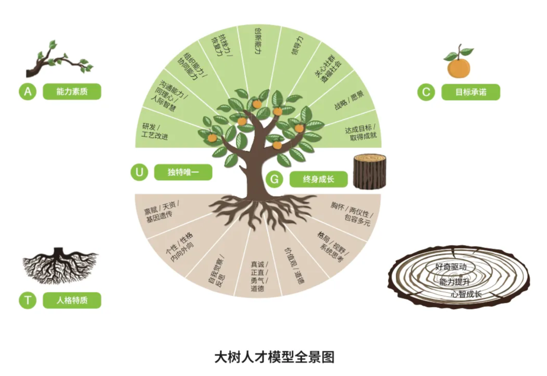 孟凯:您提到的大树模型分为五个部分,枝叶-能力素质(A),花果-目标和承诺(C),树根-人格特质(T),树干-终身成长(G),树形-独特唯一(U),那为什么是这样排序?它们之间什么关系?