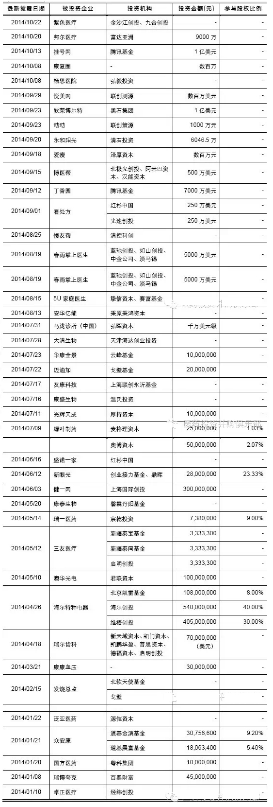 本文是由医药投资并购俱乐部汇总的2014年以来,健康医疗行业私募股权投融资明细。