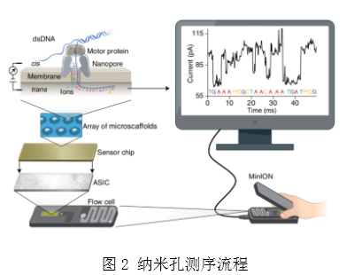 一、纳米孔测序的原理 纳米孔单分子测序技术是基于电信号测序的技术,相对于其他测序技术, 纳米孔测序技术的样本处理极其简单,无需DNA聚合酶或者连接酶,也无需dNTPs,其测序过程中包含了以下几种关键物质,如图1、图2所示。 纳米孔蛋白(Nanopore),可以嵌入到细胞膜中作为离子或分子通道的跨膜蛋白,具有天然的蛋白纳米孔。 多聚物薄膜(Membrane),跨膜蛋白会被嵌入到高电阻率的由人工合成的多聚物膜中,膜两侧是离子溶液,在两侧加不同的电位,离子就会在孔中流动,形成电流。 马达蛋白(Motor protein),在纳米孔测序文库构建时,需要在接头上连接一种马达蛋白,用于将DNA或RNA分子推入纳米孔中。 连接臂(Tether),用于锚定DNA或RNA链,防止其在溶液中飘动,并使其进入纳米孔中。 将人工合成的多聚物膜浸没在离子溶液中,膜上布满了由解旋酶和蛋白孔两部分组成的跨膜通道蛋白纳米孔,在膜两侧施加不同电压形成电压差。由于多聚物膜不可导电,电流只能通过纳米孔进行传导。连接臂引导待测链进入纳米孔,待测链在马达蛋白的牵引下经解螺旋后以单链形式穿过纳米孔(如图1)。不同碱基在通过纳米孔的恒定的电场时会引起电流不同幅度的变化,使用计算机软件及人工智能算法识别并推断出碱基类型,从而完成了DNA或RNA的测序[3](如图2)。 二、纳米孔的类型 1.生物纳米孔 纳米孔测序的概念首次在80年代被提出,并且随着纳米孔蛋白及马达蛋白的技术发展而得以实现。第一个被发现可以通过DNA或RNA影响离子电流并能使之被检测到的纳米孔蛋白是1996年Kasianowicz等提出的α-溶血素蛋白[4]。但是因DNA通过纳米孔的速率过快,而无法获得有效的电流信号。之后的2010年,耻垢分枝杆菌蛋白A(Msp-A)纳米孔被发现可以减缓DNA穿过纳米孔的速度,提高DNA单碱基的检测灵敏度[5]。随后,2014年研究者发现使用phi29 DNA聚合酶作为马达蛋白[6],可以控制DNA穿过纳米孔的速度。 生物纳米孔主要包含以上3种,均为由某种蛋白质分子镶嵌在磷脂膜上形成的天然纳米孔,可以进行灵活的生物化学修饰。然而生物纳米孔在膜稳定性、 电流噪声等方面的问题在一定程度上限制了其发展。牛津纳米孔公司在蛋白纳米孔的应用方面取得了一定进展, 他们的GridION和MinION系统就是基于生物蛋白纳米孔的测序平台。 2. 固态纳米孔 Li等在2001年开启了固态纳米孔的研究[7]。固态纳米孔主要是在氧化硅、石墨烯等固态材质上通过离子束刻蚀等技术制备出的纳米孔,因其尺寸可调、可靠性高、易修改等优点,被广泛应用于DNA测序、蛋白质检测和能量转换等研究领域[8],其中比较常见用于DNA检测的固态纳米孔是氮化硅纳米孔和石墨烯纳米孔。 相比于生物纳米孔,固态纳米孔在稳定性、电流噪声、工艺集成方面有着显着的优势,但是因为受限于如今的半导体工艺制造水平,固态纳米孔的制造还较为复杂与昂贵。 三、纳米孔测序的特点 相比于其他测序平台,纳米孔测序作为一种新型测序技术在成本、速度、读长和准确率等诸多方面有着不同的特点,其优势十分显著,主要可以概括为以下几点: 1.较长的测序读长 纳米孔测序技术利用碱基穿过纳米孔时电信号的改变实现测序,理论上可检测通过纳米孔的全部核酸序列,读长长度仅受限于所测单链DNA的长度[9]。长度长可以提供更完整、更连续的基因组组装,在具有大型结构变异和高水平重复区域的基因组中优势显著。 2.可快速实时测序 相比于其他传统测序,纳米孔测序真正意义上做到了动态实时测序,可边测序边输出结果,用户可以在测序早期了解样本的质量和状态,也可以在获得足够的数据后停止测序。同时纳米孔测序技术所需的时长也是远远短于其他测序方法,节约了操作时间同时降低了测序成本。 3.纳米孔测序设备简单便携 目前使用最成熟的MinION测序仪尺寸只有一支笔的长度,重量大约100g,长度仅10cm,可使用高速USB插入电脑,以其极小的体积彻底颠覆了人们对测序仪的印象,被称为“U盘测序仪”[10]。因其便携性,可在实验室、野外甚至太空等各种复杂环境下完成实时测序,可保证对突发疫情处理的时效性。 4.可直接对RNA进行测序 纳米孔测序可以直接对各类原始DNA和RNA进行测序,不仅节省了时间和成本,完整地保留碱基修饰的信息,还能避免将RNA逆转录为DNA扩增所产生的偏向性及可能引入的突变。其文库制备的工作流程也较为简单。 虽然纳米孔测序的优点十分明显,与前几代技术相比在成本、速度方面有着很大优势,但是目前还处在起步阶段,从测序原理到制造工艺都存在有许多问题。首先,检测准确度相对较低,这是纳米孔测序发展过程中一直致力于解决的问题,除了通过优化纳米孔和马达蛋白外,还通过独立研究开发的算法来解决准确度的问题。其次,检测通量和文库产量也限制了该技术的应用。目前仍然缺乏针对少量样品的高产量文库制备和测序规范流程。而且也并非总是能够从临床样本中获得足够大且完整的高分子量DNA和全长RNA。读取长度和产量之间仍需权衡。 四、纳米孔测序的应用 纳米孔测序有独特的优势:长度长,测序速度快,这让它在某些场景中占有很大的优势,但是通量偏低、价格高、准确度偏低也严重限制了它的应用场景。根据之前的分析,对读长要求高,但是对序列数和准确度要求不高的应用场景才是纳米孔测序的最适场景。 1.大基因组拼接