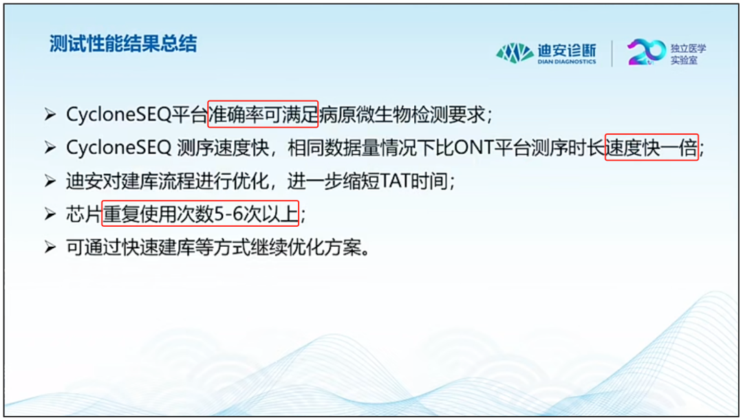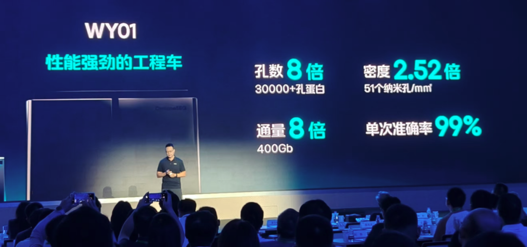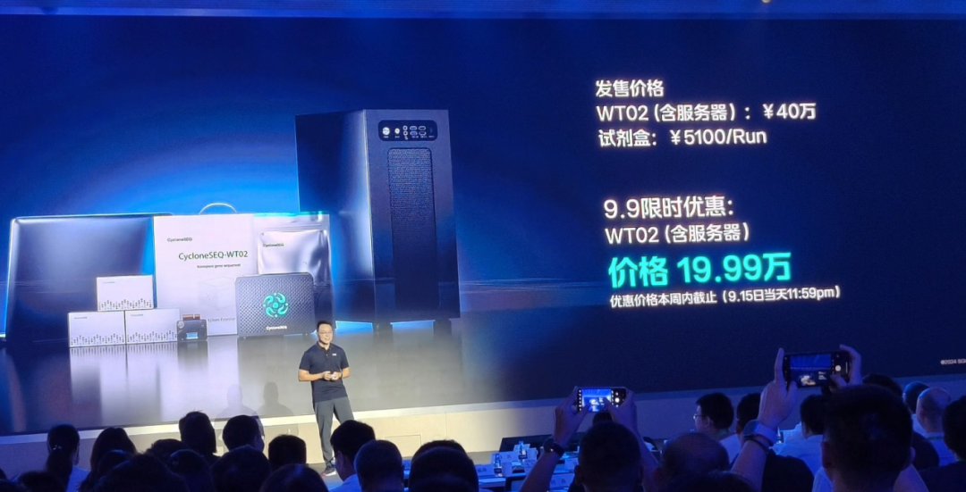 WY01是一台高通量纳米孔测序仪。在WT02的基础上,设备体积不加大,但测序芯片密度提高了2.52倍,单芯片孔蛋白数提高了8倍,达到惊人的3万个蛋白孔。单芯片通道规模提升8倍意味着单芯片数据产出也将提升8倍。同时,单次准确率提升至99%。 下午的CycloneSEQ应用分享会,来自华大、科研院校、企业客户,分别展示了基于CycloneSEQ-WT02的长时段、广范围的测试分享。领域涉及多物种基因组组装、环境微生物、农业育种、遗传病诊断、病原快速检测、肿瘤变异检测、极端环境原位测序等各个方面。 值得注意的是,这些用户均在纳米孔测序方面已有数年研发和产品转化经验。这对我们了解CycloneSEQ-WT02的真实水平,有较大参考意义。(贝纳医学,CycloneSEQ用于病原快速检测)(迪安诊断,CycloneSEQ在临检产品的表现)(华大研究院,CycloneSEQ用于物种基因组组装)02 客观来讲,CycloneSEQ-WT02在刚发布时就有如此表现,实属不易。从产品质感、性能表现、内部测试、用户测评、配套产品等多方面的集中展示可以看出,这确实是一次准备充分、积淀已久的产品发布,而非只停留在PPT阶段。而且,首批达成CycloneSEQ签约合作意向的科研及临床用户代表,就达到了70家。在整体表现不逊色进口品牌的基本前提下,基于用户视角,大家选择华大CycloneSEQ的理由,会是什么?价格&成本,这也是所有与会的研究者、应用企业都在会议中明确提到的问题:- 研究者希望价格的下降,实现测序自由,让有限的经费生产更多的数据;